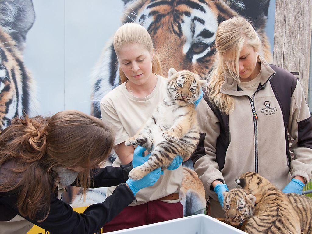 Die drei jungen Tiger sind zwischen 4,3 und 4,7 Kilogramm schwer, wie der Walter-Zoo am Freitag mitteilte. «Vermutlich sind es zwei Männchen und ein Weibchen», sagt Zoodirektorin und Tierärztin Karin Federer gemäss Communiqué. Ganz sicher lasse sich das Geschlecht in diesem Alter noch nicht bestimmen.