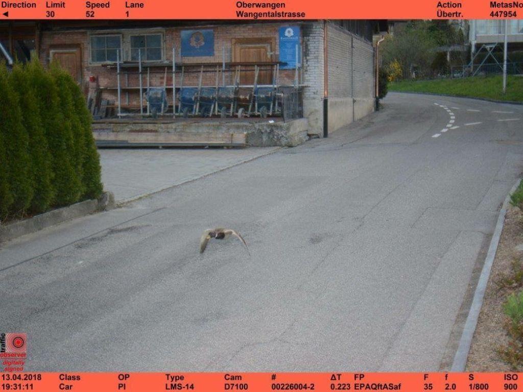 Im Tiefflug raste das Tier in einer Tempo-30-Zone im Ortsteil Oberwangen in die Radarfalle und wurde prompt geblitzt, wie verschiedene Medien mit Verweis auf einen Facebook-Eintrag der Gemeinde am Freitag berichteten.