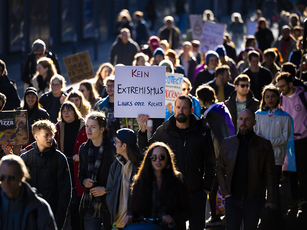 (Keystone-SDA) Unter dem Motto «zusammen für unsere Demokratie» haben sich am Samstagnachmittag einige hundert Personen in Zürich zusammengefunden. Der bewilligte Demonstrationszug führte vom Turbinenplatz zum Kasernenareal.