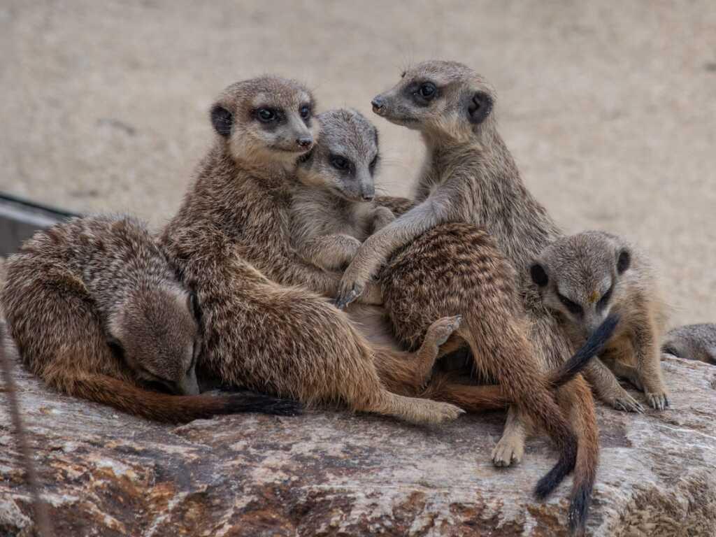 Wie in der freien Natur arbeiten auch diese Erdmännchen intensiv als Gruppe zusammen. Sie verteilen die Arbeiten untereinander und wechseln sich dabei ab. Einer ist immer Wächter und meldet etwa, wenn ein Vogel kreist oder sich ein Schakal nähert.