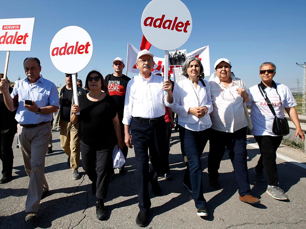 Kilicdaroglu, Chef der Republikanischen Volkspartei (CHP), setzte am Samstag seinen mehr als 400 Kilometer langen «Marsch für Gerechtigkeit» den er am Donnerstag aus Protest gegen die Festnahme des CHP-Abgeordneten Enis Berberoglu begonnen hatte. Kilicdaroglu will bis zum Istanbuler Gefängnis von Berberoglu zu Fuss zu marschieren.
