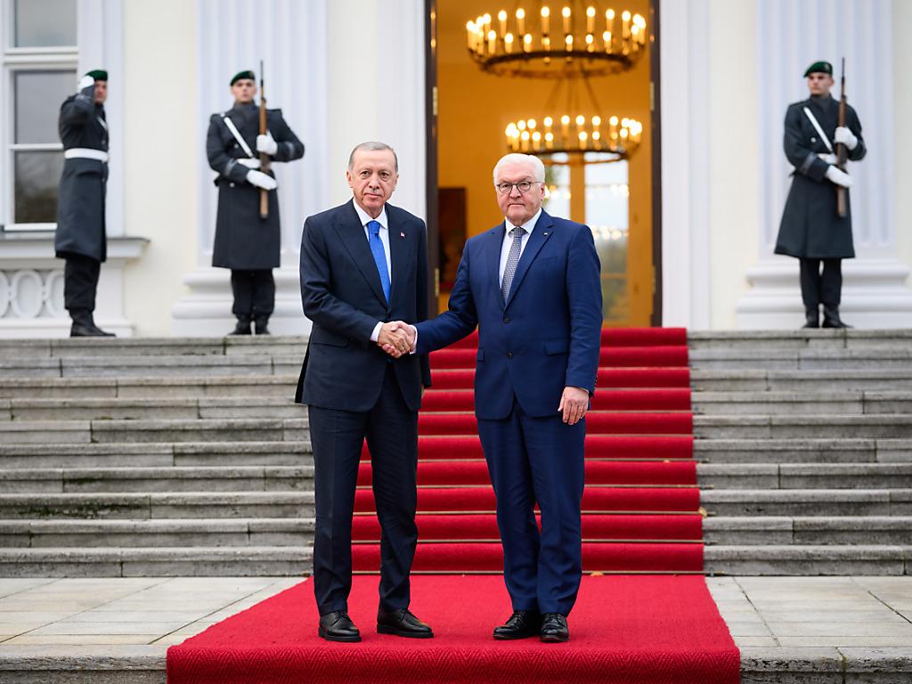 (Keystone-SDA) Kurz vor dem Treffen von Bundeskanzler Olaf Scholz und dem türkischen Präsidenten Recep Tayyip Erdogan hat die Türkei auf ein deutsches Ja zum türkischen Kauf von Eurofighter-Jets gedrängt. Ankaras Interesse an 40 Kampfflugzeugen sei der Regierung bekannt, sagte Regierungssprecher Steffen Hebestreit am Freitag in Berlin. Erdogan traf derweil im Schloss Bellevue Bundespräsident Frank-Walter Steinmeier. Ob das türkische Interesse an den Kampfflugzeugen auch bei dem für den Abend geplanten Essen mit Scholz auf den Tisch kommen sollte, war zunächst unklar.