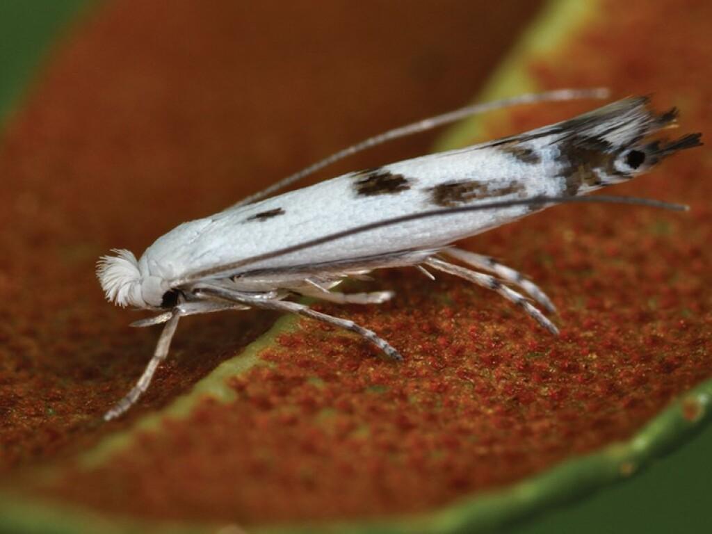 Für die Verpuppung verlässt die Raupe das befallene Blatt und legt auf dessen Unterseite ein Hängematten-ähnliches Gespinst an, wo sie sich schliesslich verpuppt. Im Labor beobachteten die Forscher, dass nach etwa zehn Tagen ein rund zwölf Millimeter grosser, nachtaktiver Falter mit weiss-schwarz-gescheckten Flügeln schlüpfte.