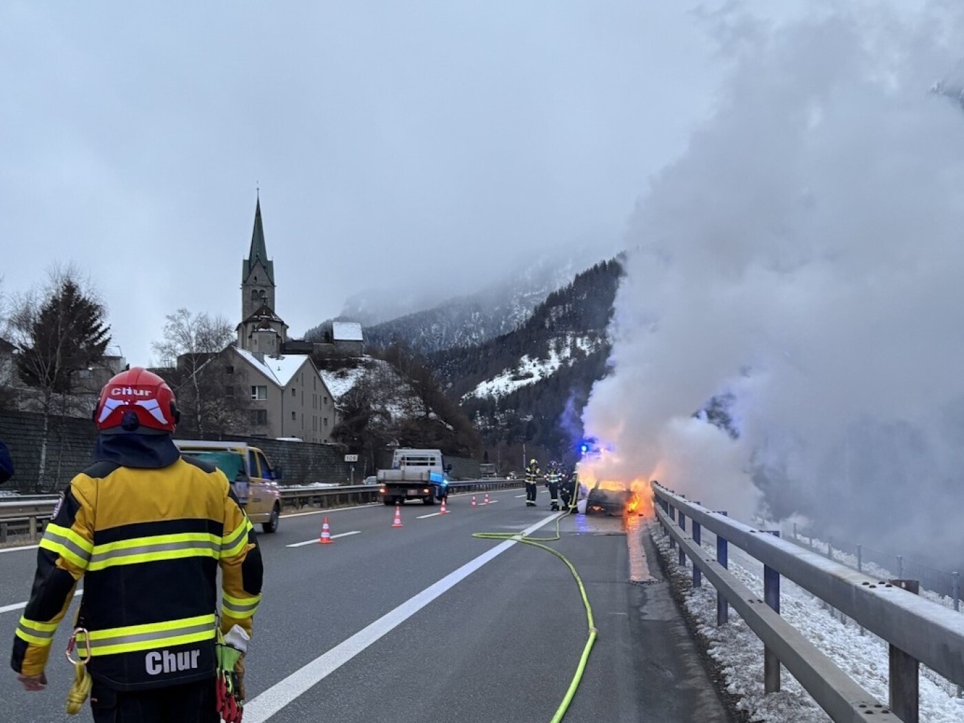 Auf der Autobahn A13 bei Domat/Ems ist ein Auto am Donnerstagmorgen in Brand geraten. Die Feuerwehr löschte das Feuer.