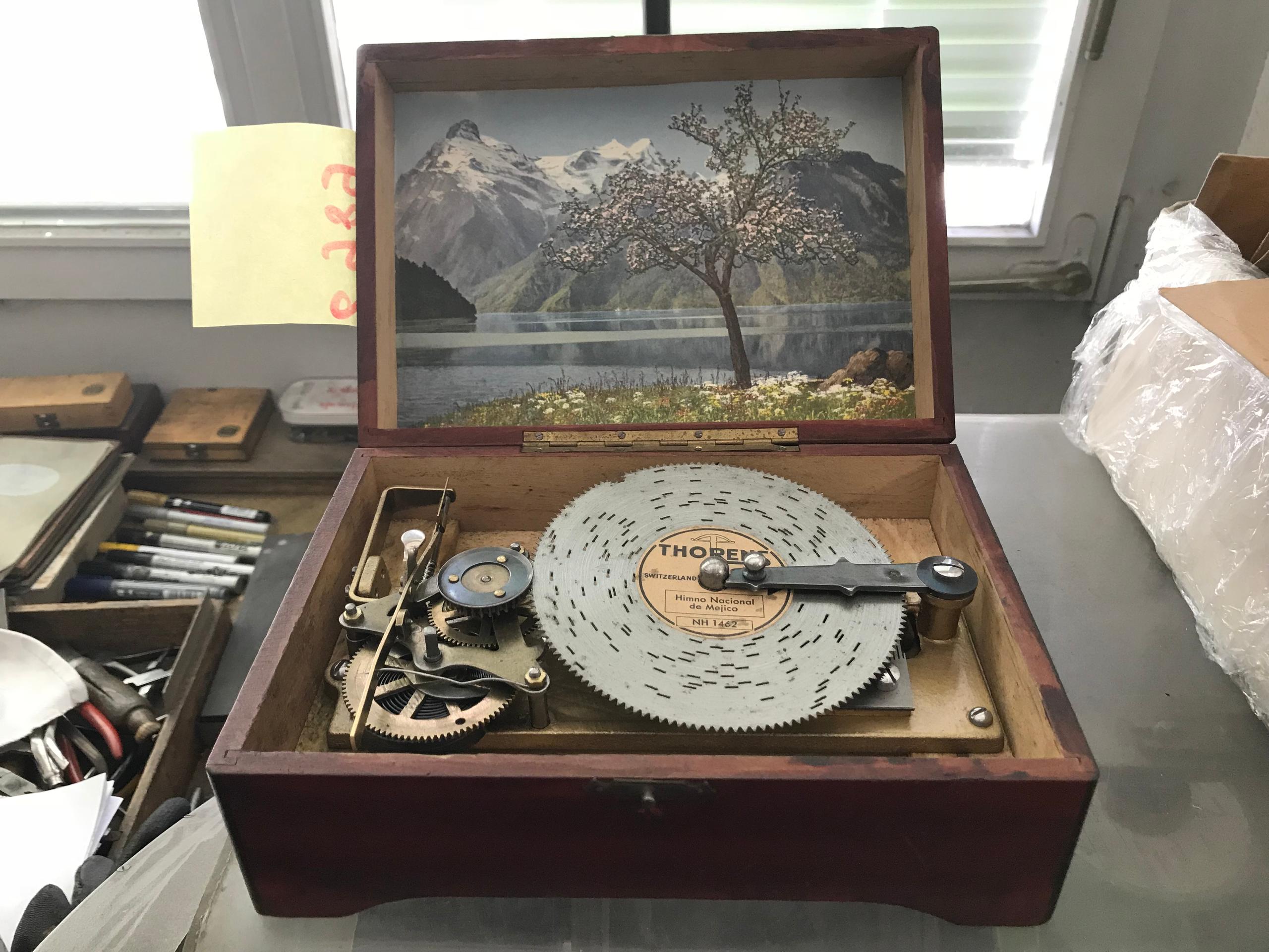 Diese Musikbox aus dem Haus Thorens, das bekannt für seine Plattenspieler war, kann auswechselbare Lochplatten abspielen. Auf dem Plattenteller liegt hier die Nationalhymne Mexikos.
