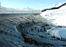 Die Zuschauertribüne ist für 5000 Leute ausgelegt. Bei Temperaturen von -15 Grad arbeiten zahlreiche dickvermummte Spezialisten. Ständig fahren Lastwagen mit allerlei Material vor: Container, Generatoren, (kilo-)meterweise Kabel, WC-Häuschen, bündelweise Slalomstangen, Kisten gefüllt mit Steckern und Zwischenstücken, Kunstoffrohre, das Siegerpodest in Einzelteile zerlegt, Kupplungen, Werkzeuge und Bohrer in Holzkisten.