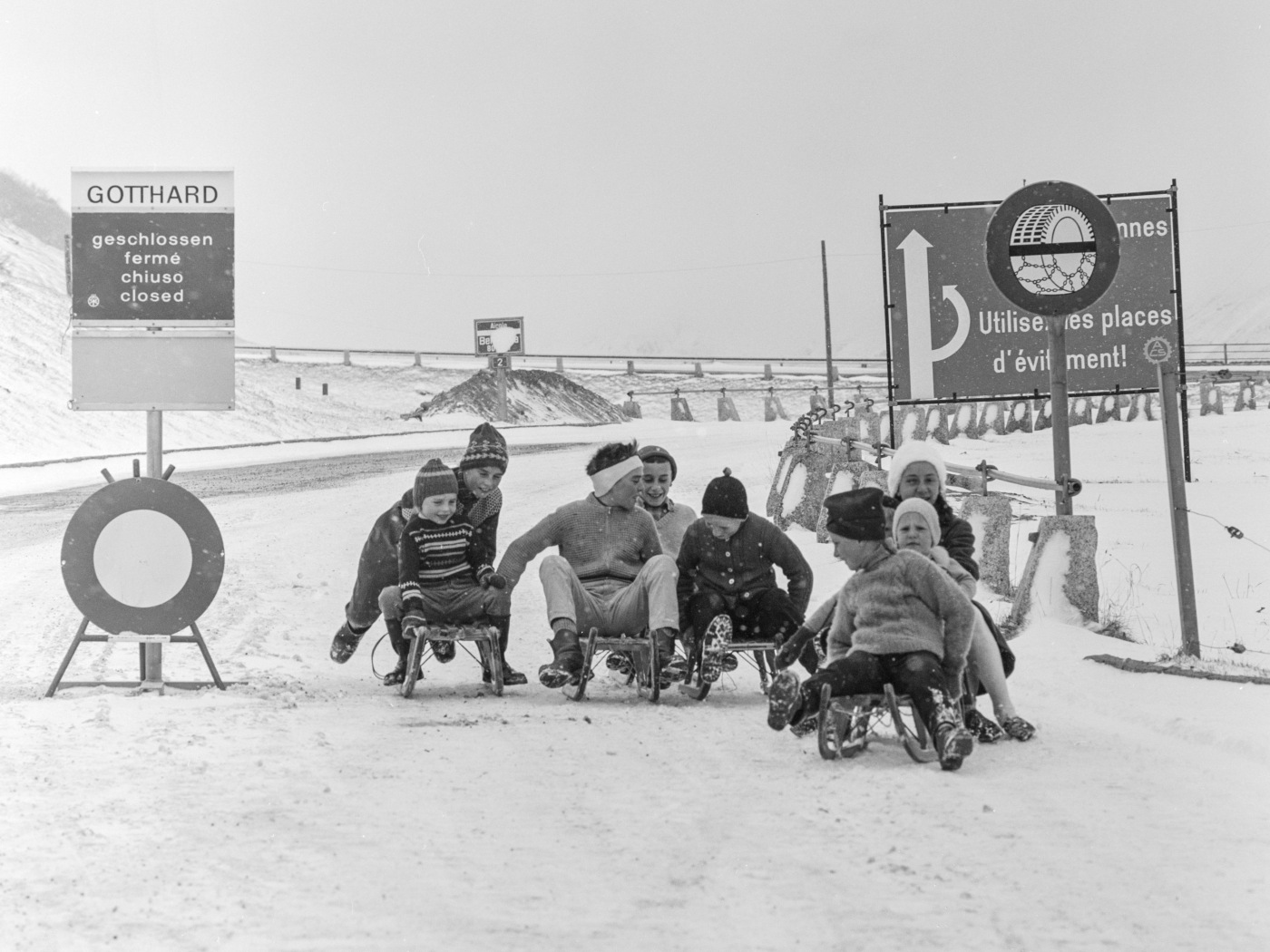 Am 4. Januar 1962 hat der Schweizer Touring Club die Schliessung von 15 Alpenpässen bekanntgegeben. Zum Schlittenfahren schienen die Strassenbedingungen auf dem Gotthard hingegen ideal.