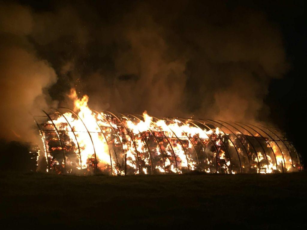 Kurz vor sechs Uhr mussten die Feuerwehren von Gurmels und Murten und die Polizei nach Ulmiz ausrücken, um den Brand zu löschen. In dem 10 mal 30 Meter grossen Foliengewächshaus befanden sich etwa 100 Tonnen Heu, Emd und Stroh sowie diverse Gerätschaften. Tunnel und Inhalt brannten vollständig ab.