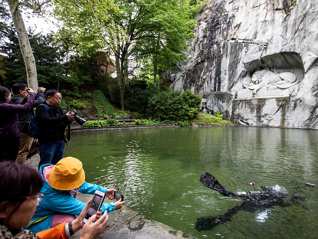 Fotografin taucht mit Kamera in Teich vor Luzerner Löwendenkmal