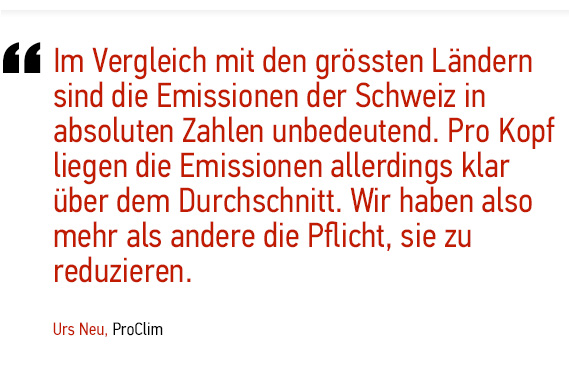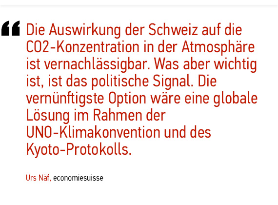 Wenn man den Grossteil der Länder von einer koordinierten Klimapolitik überzeugen wolle, sei es unerlässlich, dass auch die Schweiz ihre Emissionen reduziere und ihre Entscheide kommuniziere, betont Urs Näf, zuständig für Energie- und Umweltfragen beim Dachverband der Schweizer Wirtschaft. «Die eigene Verantwortung zu übernehmen, ist auf internationaler Ebene ein starkes Signal.»
