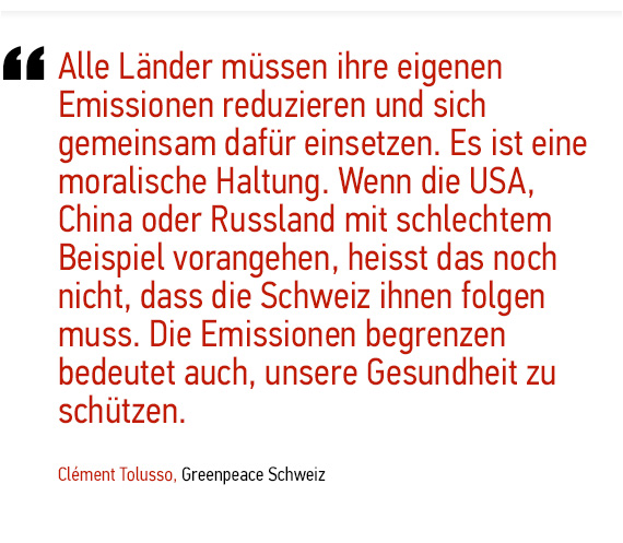 In der Schweiz ist der Verkehr der Hauptverantwortliche für die CO2-Emissionen. «Fahrzeuge und Heizanlagen setzen nicht nur CO2 frei, sondern auch andere Schadstoffe», betont Clément Tolusso, Sprecher von Greenpeace Schweiz.