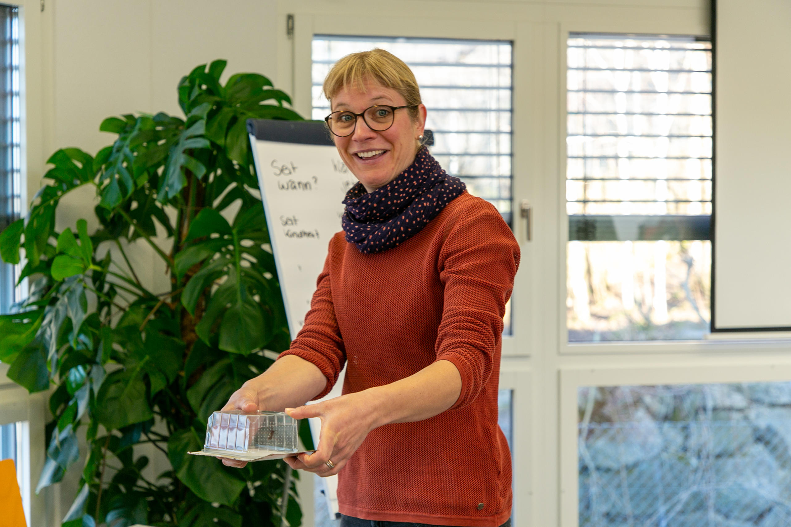 Das Gruppengefühl und der Mut der Einzelnen wächst. Klimmek fragt: «Sollen wir mal eine Lebendige anschauen?» «Ja, gern!», antwortet Teilnehmer Tobias. Und das lehrt das Seminar so: Mit dem Plastikgefäss in einer Hand langsam, damit es keinen Luftzug gibt, in die Nähe der Spinne kommen. Das Gefäss über der Spinne senken, so dass sie nicht mehr rauskommt. Dann das Gefäss leicht anheben und langsam ein Stück Karton darunter schieben – die Spinne wird auf den Karton steigen und kann unbeschadet entfernt werden. Nachdem es die Kursleiter:innen vorgemacht haben, sagt Ursina: «Darf ich das mal probieren?» Es fällt ihr nicht in jedem Moment leicht. Psychologin Süss bekräftigt: «Merkst du, wie sehr du die Kontrolle über die Situation hast.» Ursina läuft mit der Spinne eine Runde durch den Raum. Draussen drehen die Tiger eine Runde, der Zoo schliesst bereits. Drinnen gibt es Applaus.
