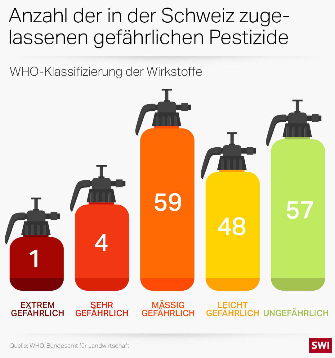 Die Schweiz mag im globalen Vergleich im Mittelfeld positioniert sein, aber was bedeutet das für die Gefahren für die Bevölkerung? Das Spektrum der Toxizitätsprofile von Pestiziden ist allgemein sehr breit. Neue Daten der Weltgesundheitsorganisation (WHO), welche die Pestizide nach ihrem Schadenspotenzial für den Menschen einstufen, helfen bei der Beurteilung.
