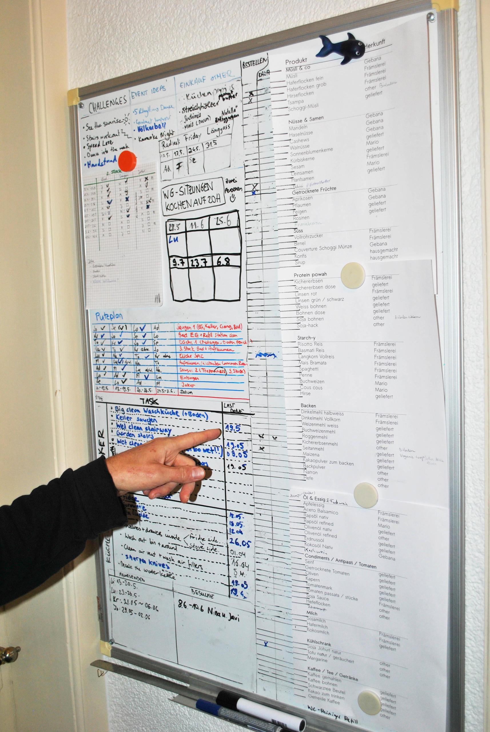 Schon das Whiteboard im Eingangsbereich zeigt, wie gut diese WG organisiert ist: Fast 100 Produkte, von Aprikosen bis Natron, sind dort gelistet. Wo Nachschub gebraucht wird, markiert das ein Kreuz. Die Gewürzpackungen in der Küche haben Pfadfinderlager-Format, aber sind klein im Vergleich zu den Vorratssäcken und -fässern im Keller.