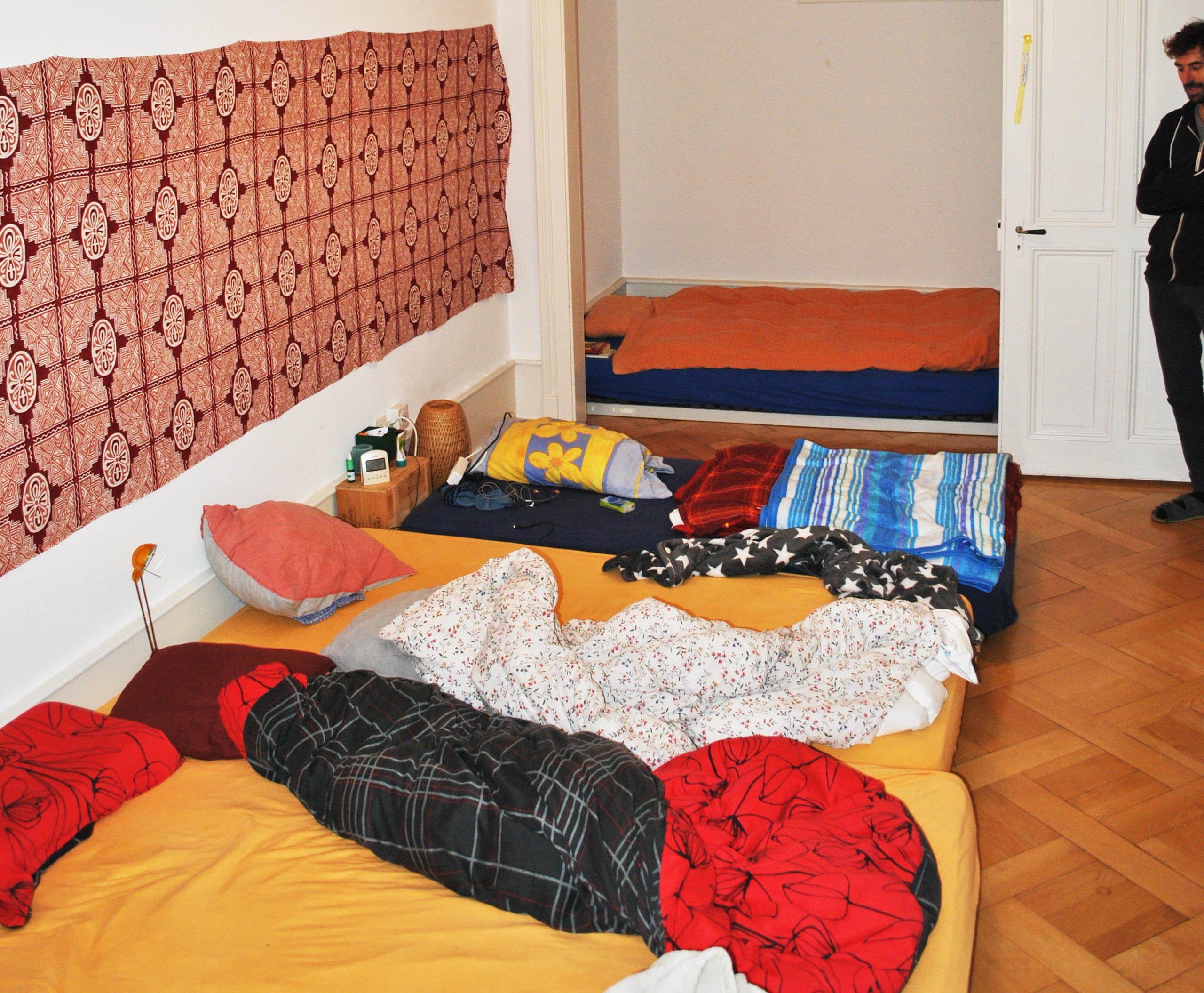 Die Assoziation an ein Ferienlager ist präsent, als Lorena, Johannes und Adrien swissinfo.ch zu den beiden Schlafräumen führen: Matratze an Matratze – kuschlige Massenschläge, in denen laut den Dreien nachts «ein Gefühl von Herdenwärme» spürbar wird. Manchmal teilen sich auch Pärchen eine Matratze im Schlafzimmer, wenn der Partner oder die Partnerin zu Besuch ist – oder man trägt sich eine Nacht lang für einen der Rückzugsräume ein.