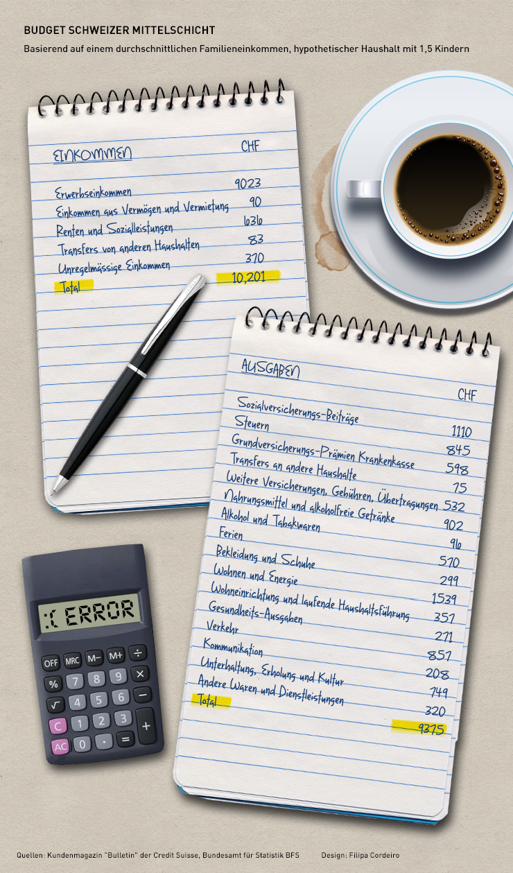 Ein durchschnittliches Einkommen von mehr als 10'000 Franken für eine Familie scheint auf den ersten Blick viel zu sein. Aber wenn man die unvermeidbaren Ausgaben abzieht und die hohen Lebenshaltungskosten in Betracht zieht, bleibt Ende des Monats nicht mehr viel übrig.