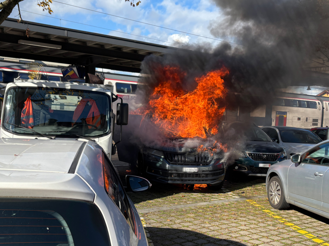 (Keystone-SDA) Durch das Feuer wurden auch umstehende Fahrzeuge teils schwer beschädigt, verletzt wurde aber niemand, wie die Polizei schreibt. Der Notruf sei gegen 14.30 Uhr eingegangen und die Feuerwehr habe den Brand schnell löschen können. Gemäss bisherigen Erkenntnissen steht ein technischer Defekt als Ursache im Vordergrund.