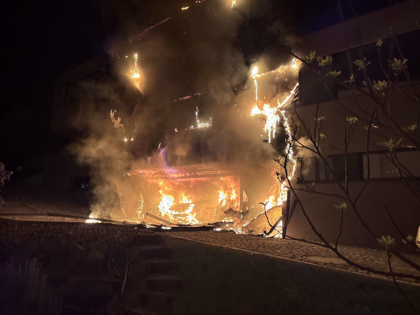 (Keystone-SDA) Um drei Uhr nachts wurde der Einsatzzentrale gemeldet, dass es in der Garage eines Hauses brenne und das Feuer auf das Doppeleinfamilienhaus übergreife, teilte die St. Galler Kantonspolizei am Dienstag mit.