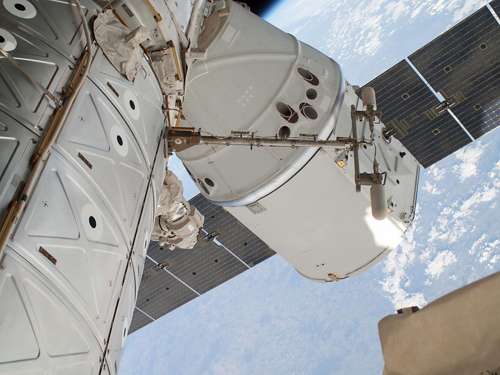 "Dragon"-Raumfrachter an der Internationalen Raumstation ISS. Derzeit herrscht auf der ISS Hochbetrieb: fünf Raumschiffe sind derzeit angedockt. (Themenbild) KEYSTONE/AP NASA sda-ats