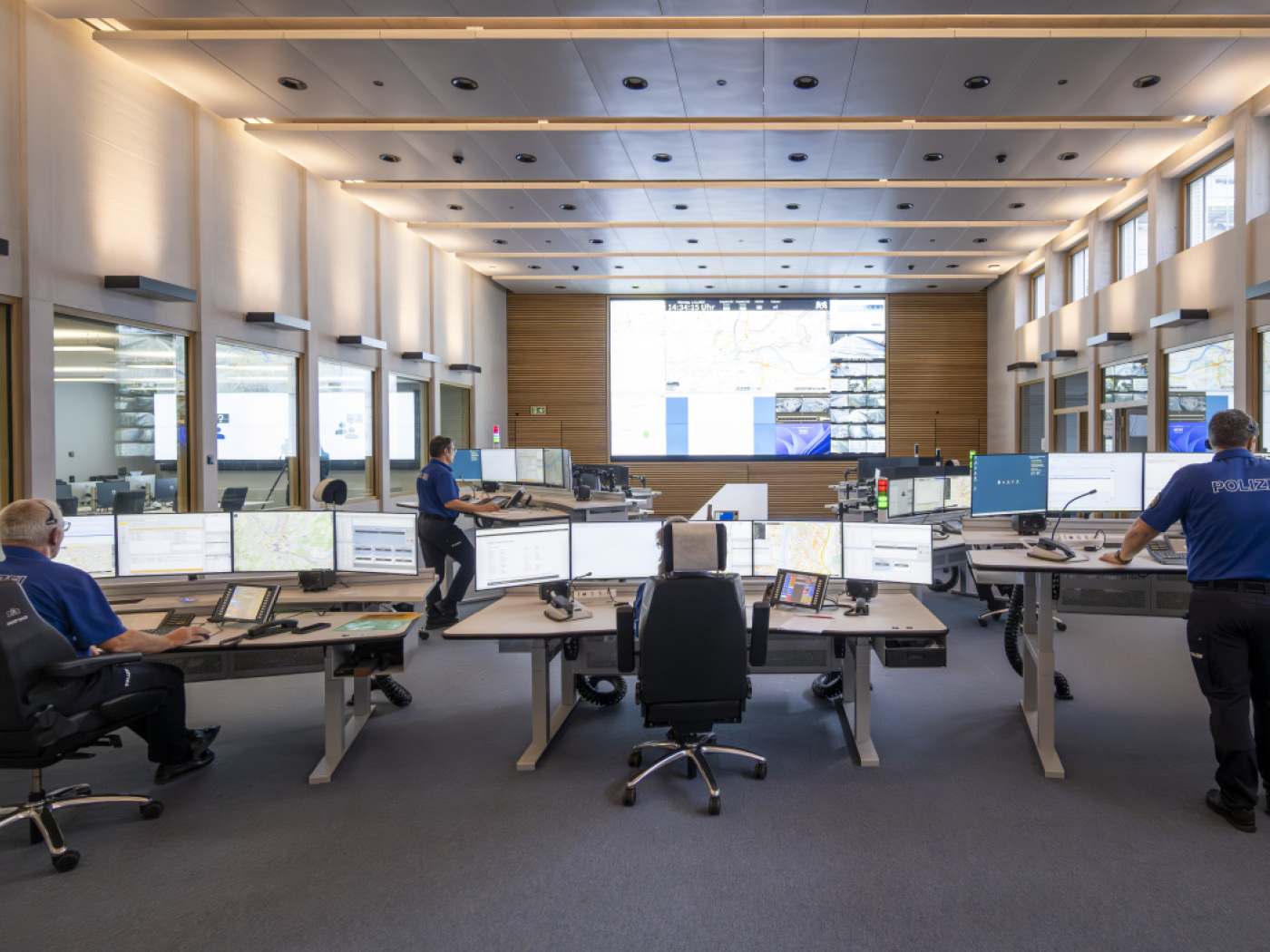 In der neuen Einsatzzentrale stehen neun Disponenten-Arbeitsplätze zur Verfügung. Herzstück der neuen Zentrale ist eine Riesenanzeige mit aktuellen Lageinformationen für die Polizistinnen und Polizisten. Demnächst wird zudem die Verkehrsleitzentrale der Verkehrspolizei in die Einsatzzentrale Spiegelhof integriert.