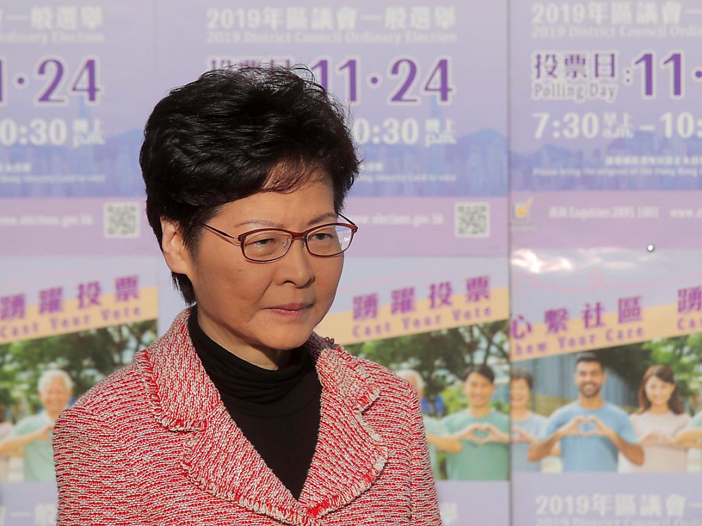Für Hongkongs Regierungschefin Carrie Lam zeigen viele Analysen des Wahlresultats, dass "die Ergebnisse die Unzufriedenheit des Volkes über die gegenwärtige Situation und tiefsitzende Probleme in der Gesellschaft widerspiegeln". (Bild vom 24. November) KEYSTONE/AP/KIN CHEUNG sda-ats