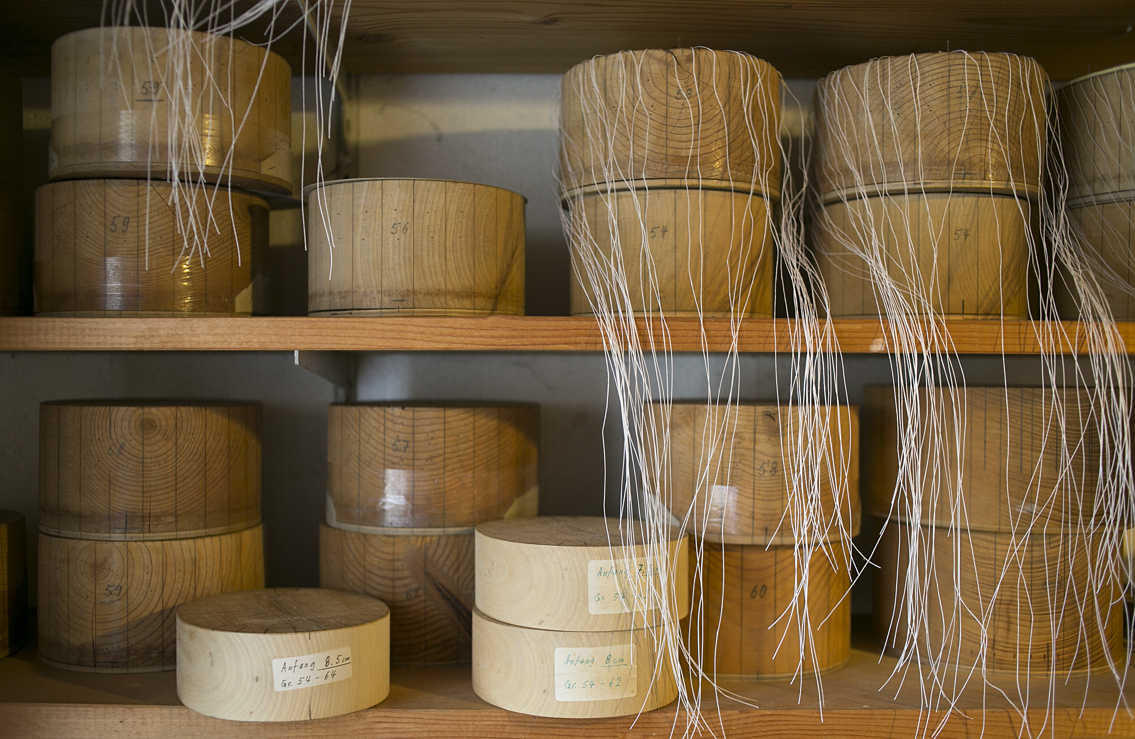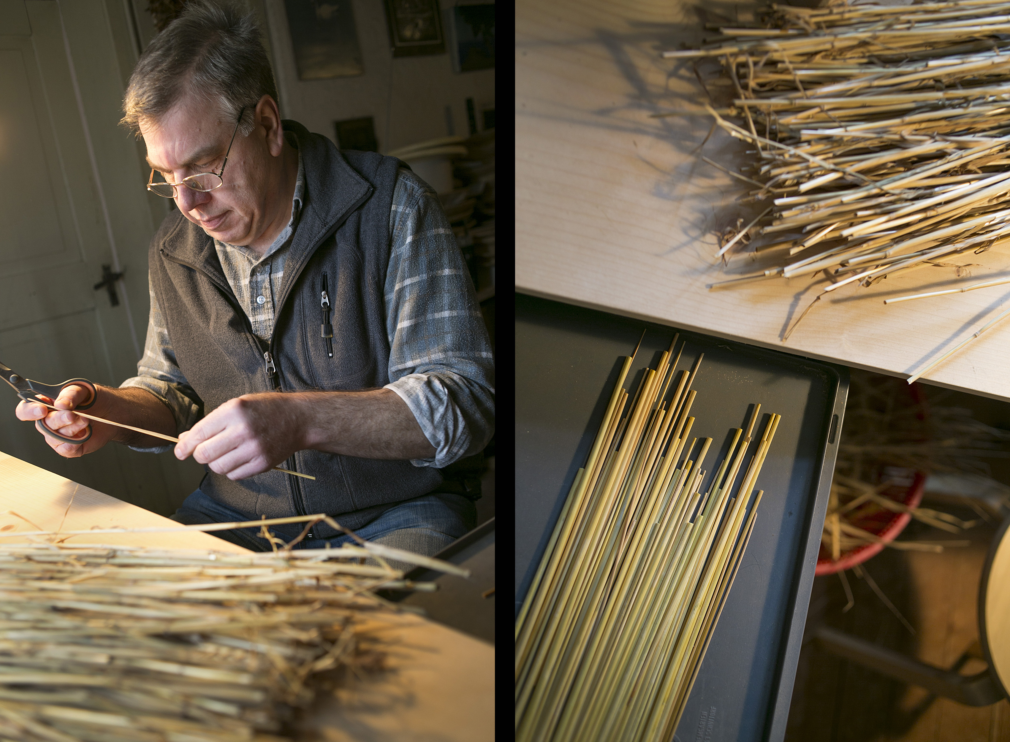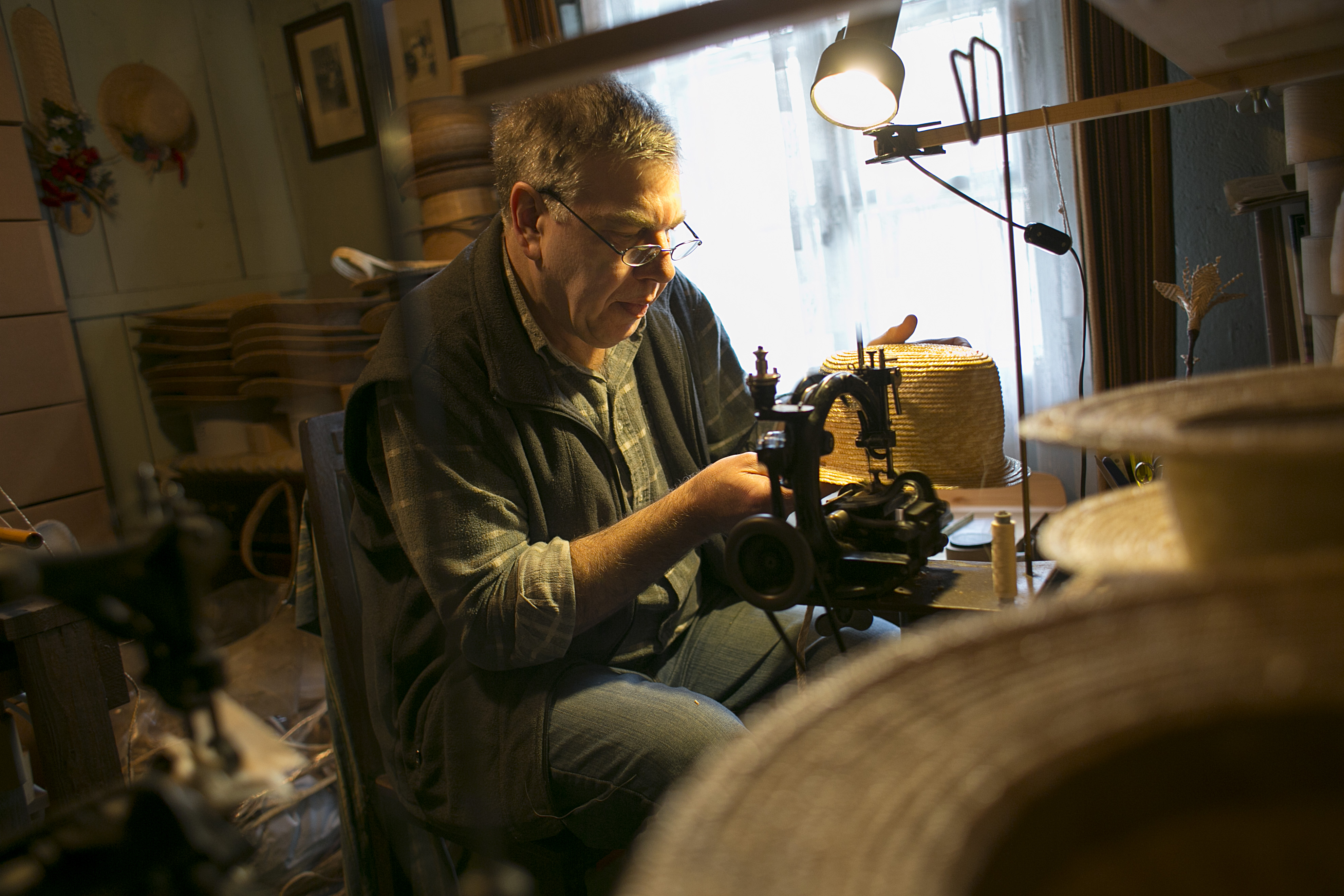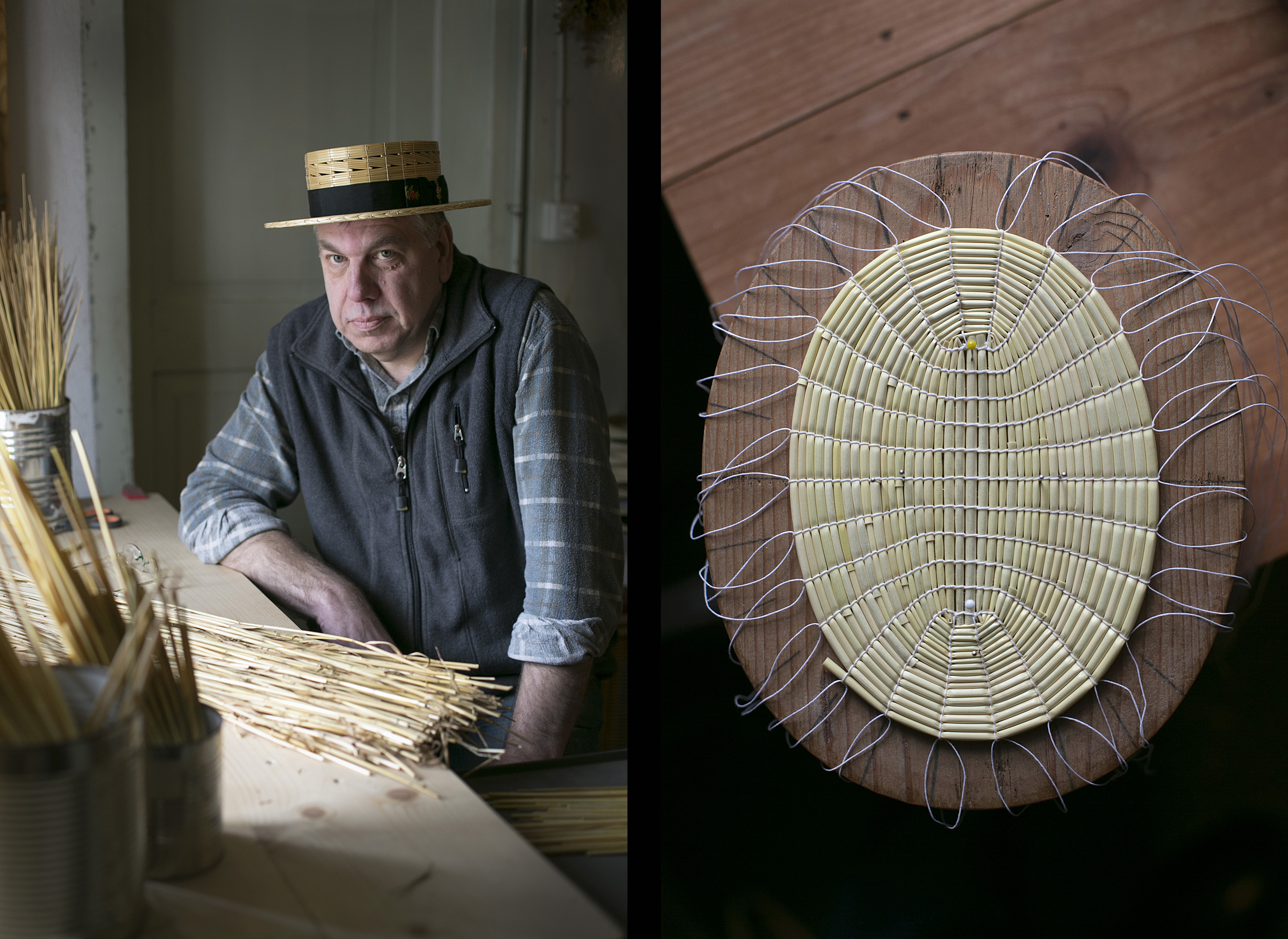 Es gibt zwei Sorten Strohhüte, geknüpfte und genähte. Wismer sitzt nahe am Fenster, leicht gebeugt über der ovalen, aus Lindenholz gefertigten Passform, auf die er sorgfältig ausgewählte Strohhalme aufzieht und miteinander verknüpft. Für die Herstellung des Röhrlihuts, Wismers Klassiker, braucht er einen ganzen Tag, allein zwei Stunden für den Deckel. Dazu verwendet er Weizenstroh aus lokalem Anbau. Edlere Modelle sind mit Roggenstroh ausgestattet. Das Rohmaterial schneidet, trocknet und sortiert er selbst.