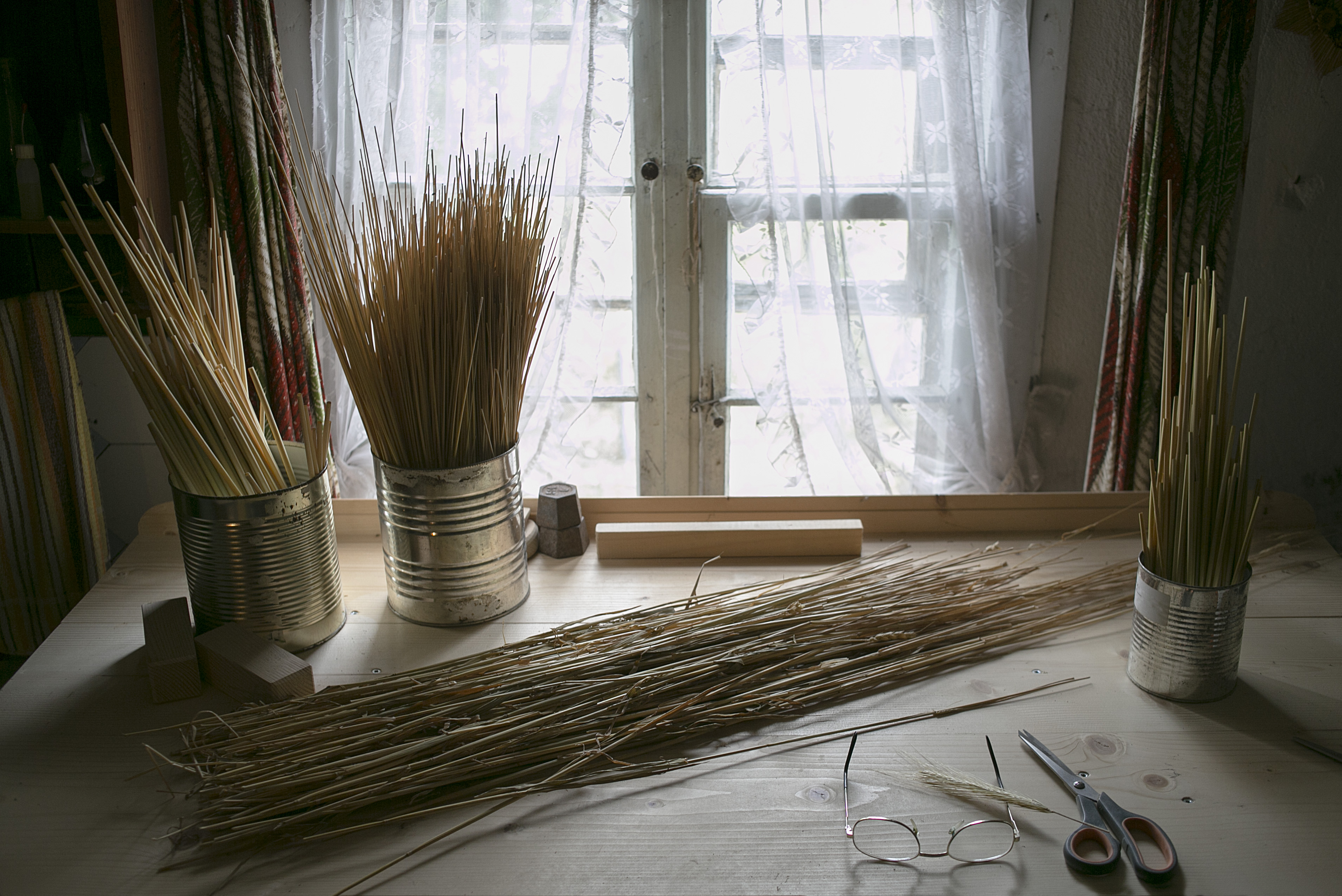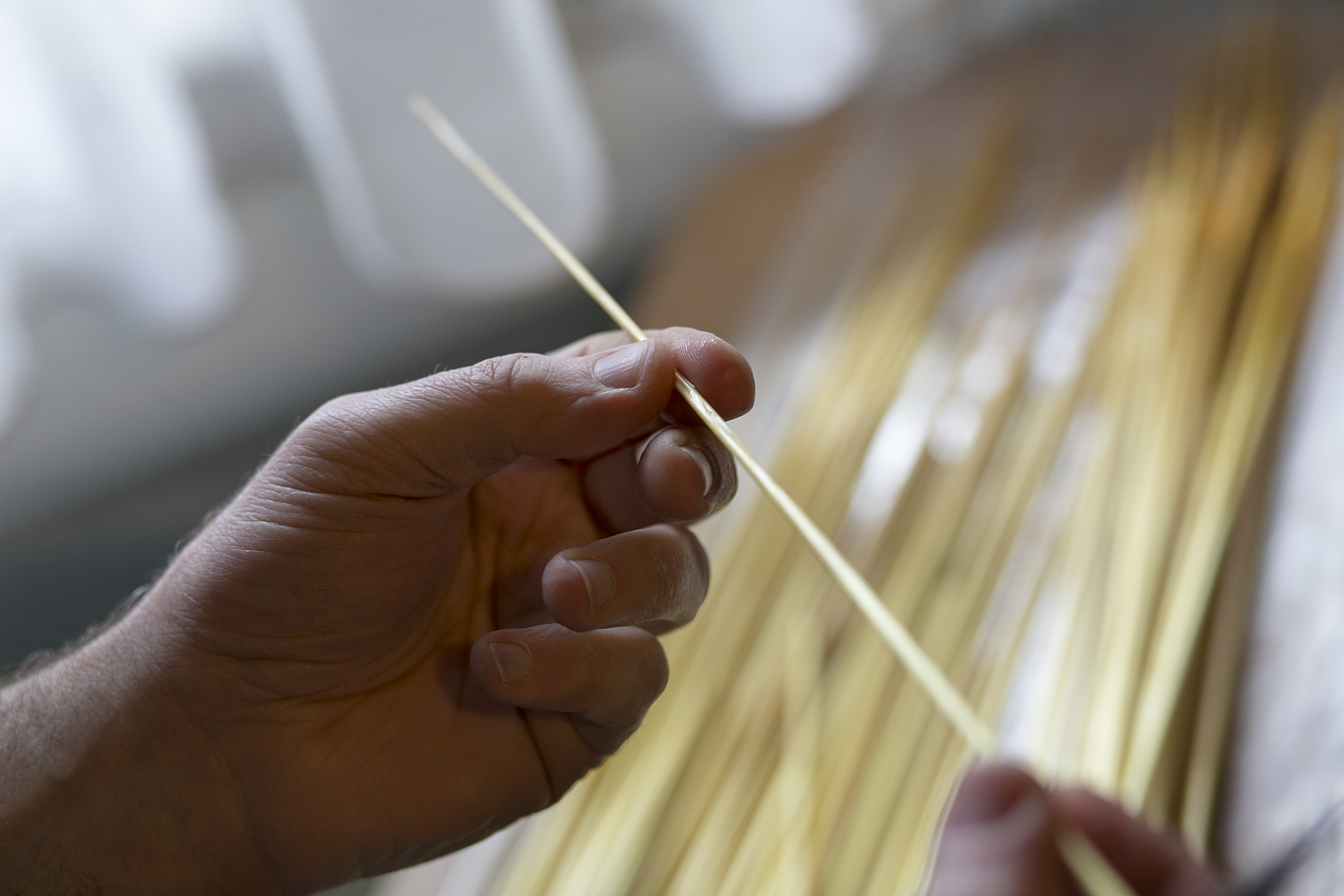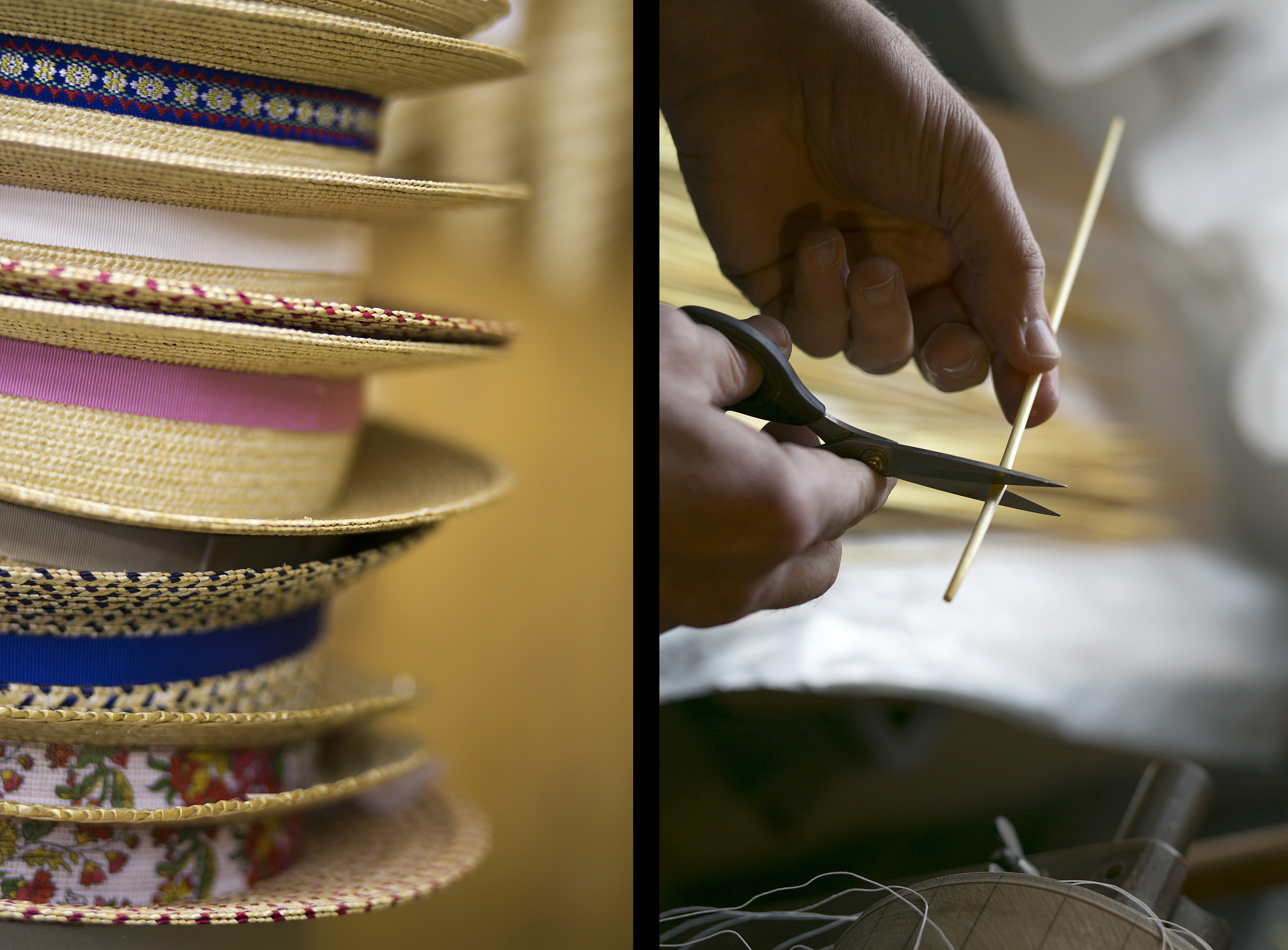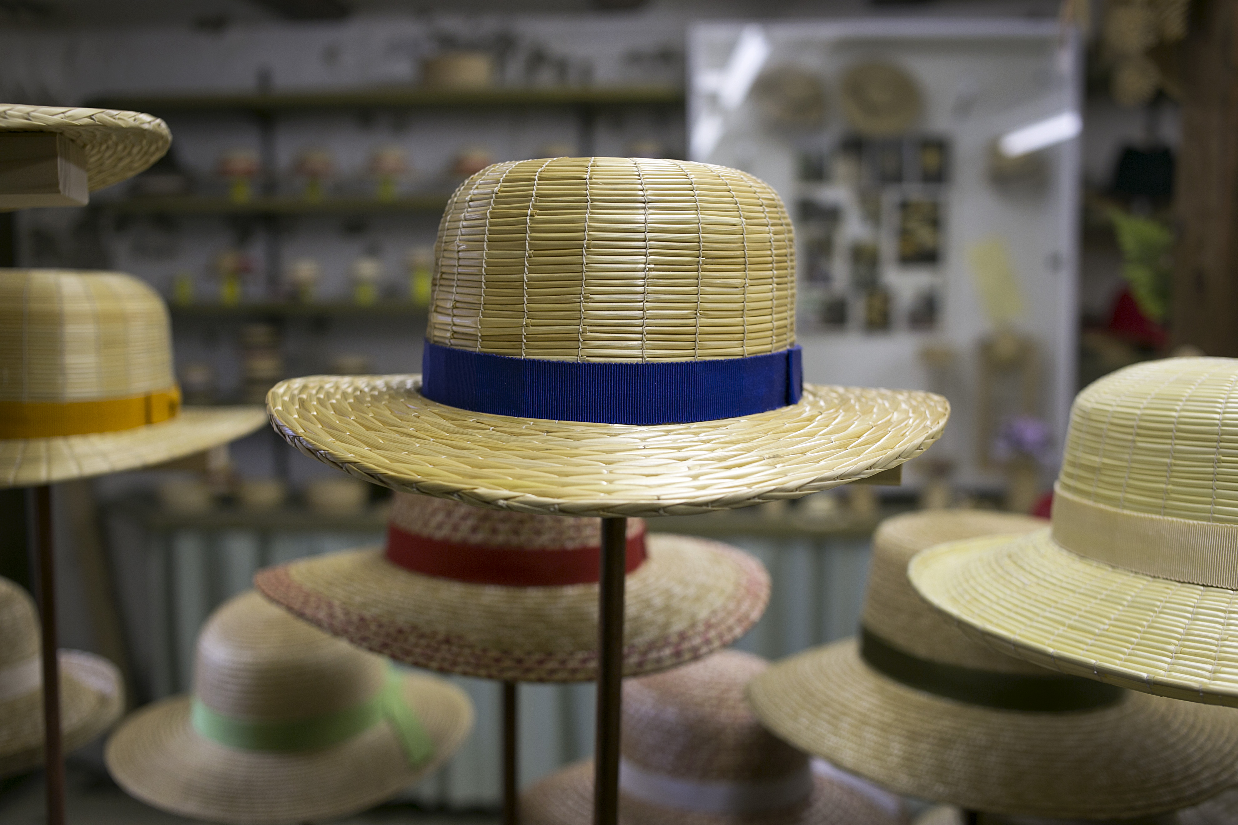 Es gibt zwei Sorten Strohhüte, geknüpfte und genähte. Wismer sitzt nahe am Fenster, leicht gebeugt über der ovalen, aus Lindenholz gefertigten Passform, auf die er sorgfältig ausgewählte Strohhalme aufzieht und miteinander verknüpft. Für die Herstellung des Röhrlihuts, Wismers Klassiker, braucht er einen ganzen Tag, allein zwei Stunden für den Deckel. Dazu verwendet er Weizenstroh aus lokalem Anbau. Edlere Modelle sind mit Roggenstroh ausgestattet. Das Rohmaterial schneidet, trocknet und sortiert er selbst.