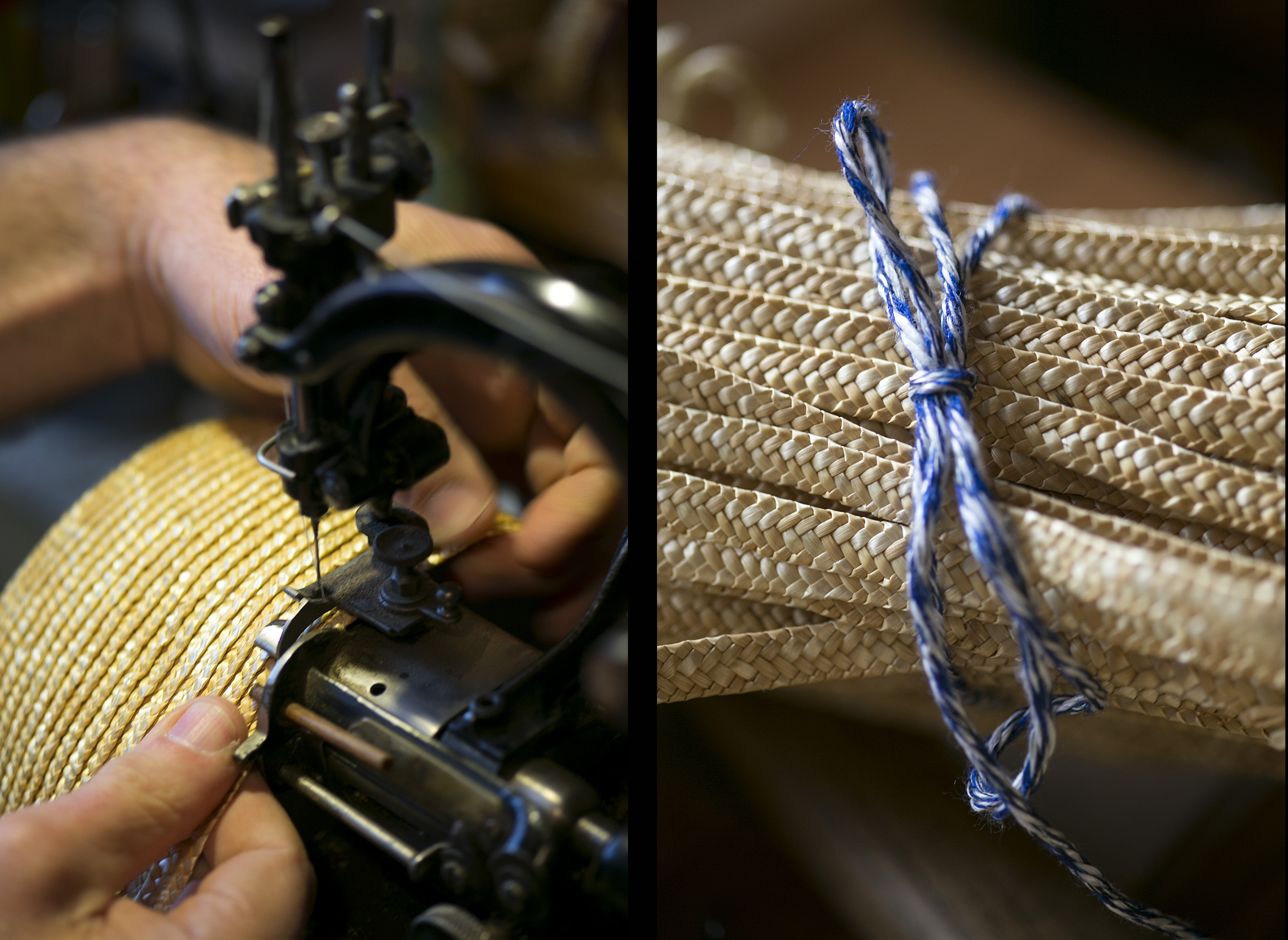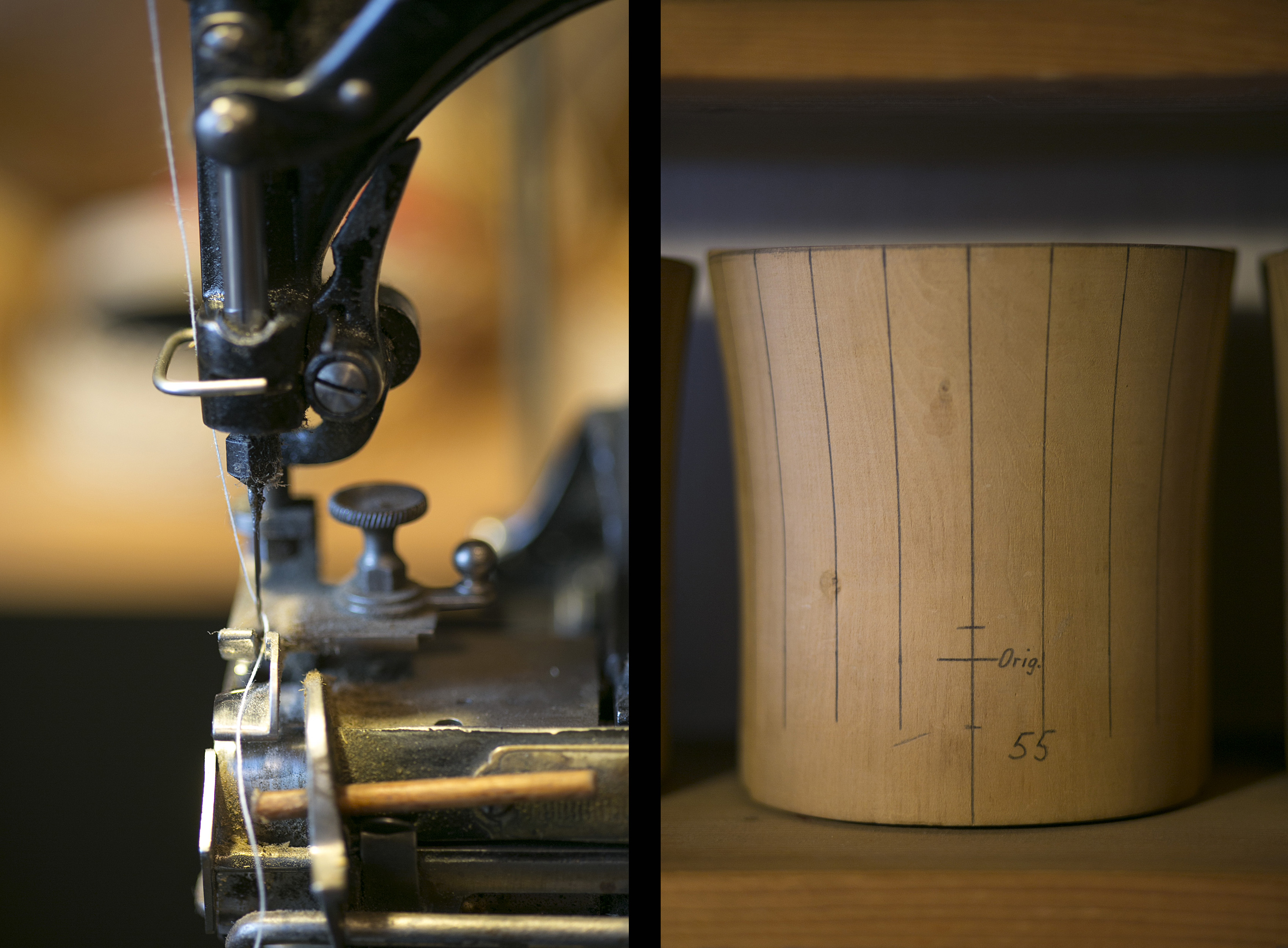 Im Zimmer nebenan steht eine Nähmaschine, Grossmann-Dresdensia B, Baujahr 1900. Für einen breitkrempigen Hut braucht es etwa 30 Meter vorgefertigtes Band aus Strohgeflecht, in einer halben Stunde ist er genäht und wird mit Dampf in seine endgültige Form gepresst. Ein farbiges Garniturband mit Schleife schmückt den Hut aussen, innen ein Stoffband, «Entrée» genannt.