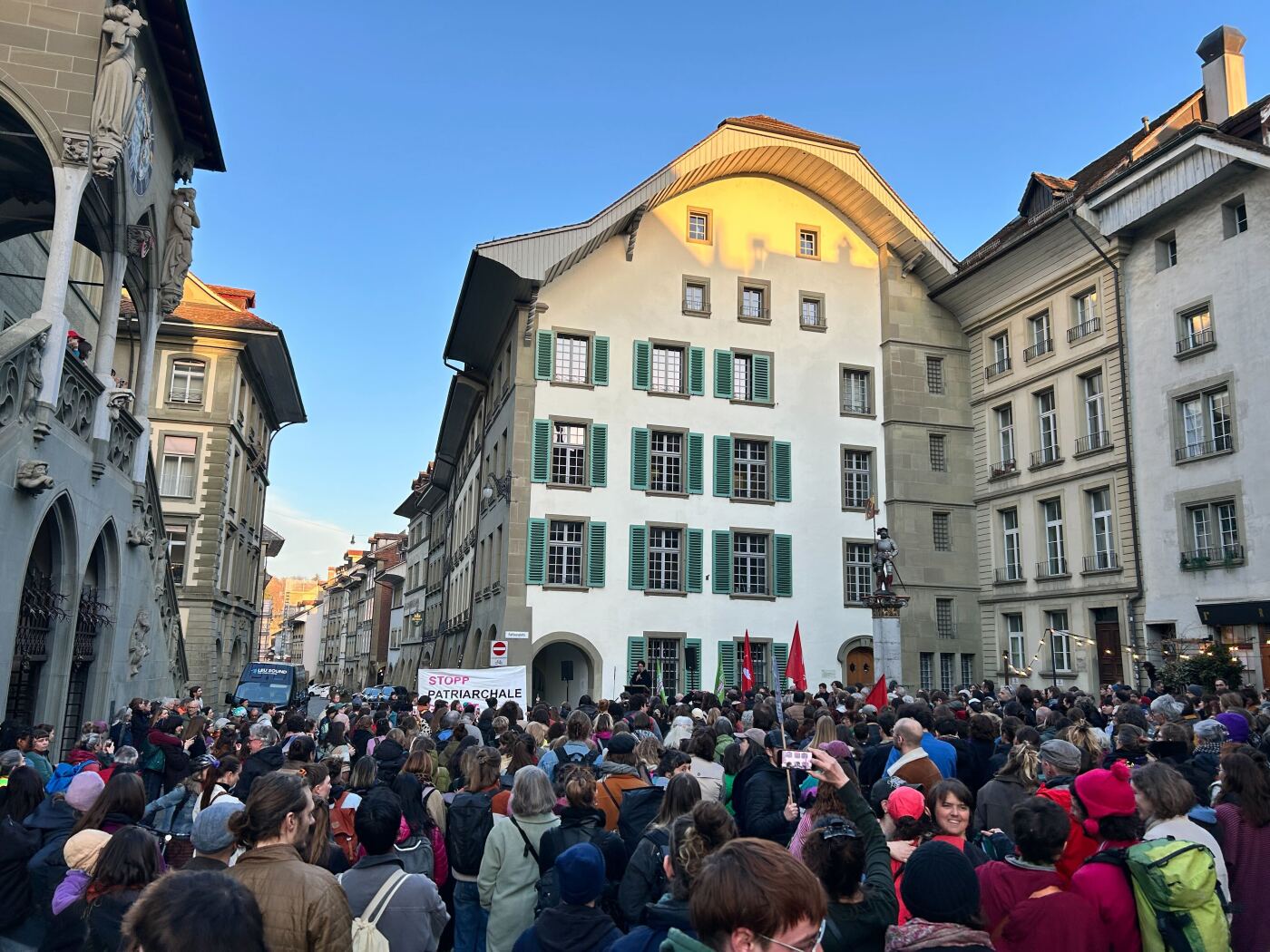 Rund 600 Personen haben am Dienstagabend vor dem Berner Rathaus gegen patriarchale Gewalt demonstriert. Sie forderten besseren Schutz und zusätzliche Mittel für Menschen, die von geschlechtsspezifischer und sexualisierter Gewalt betroffen sind.