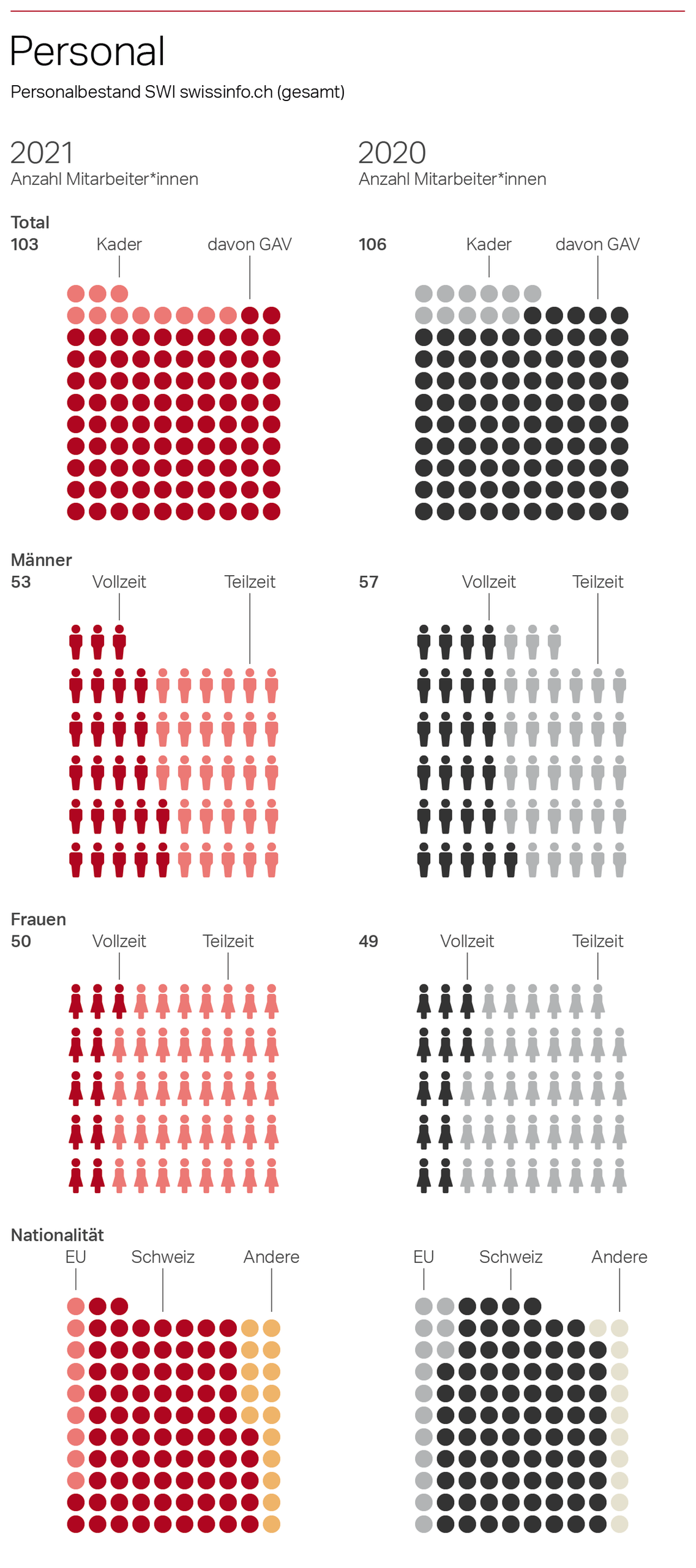 Zu guter Letzt noch Zahlen und Fakten rund um SWI swissinfo.ch und unser Team mittels selbstsprechender Illustrationen: