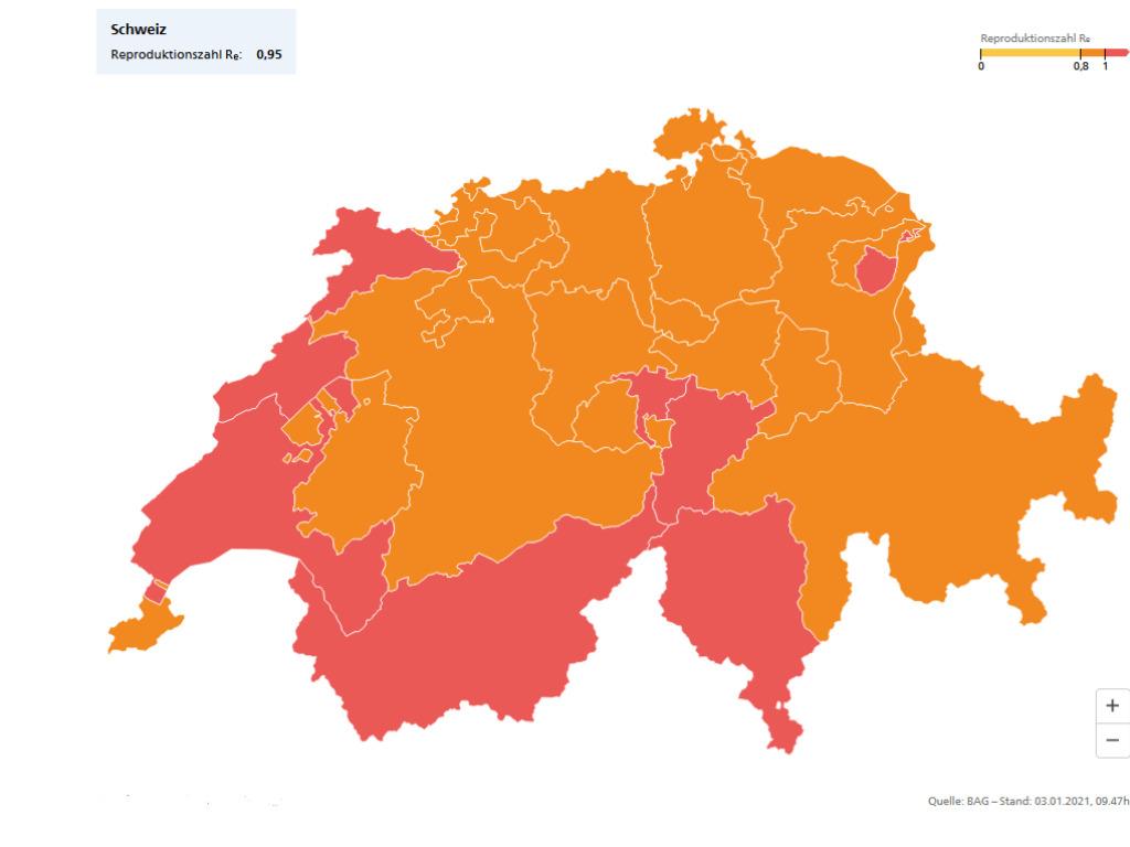 Schweizweit war der R-Wert gemäss BAG am 5. Dezember unter 1 gesunken. Bis am 16. Dezember ging er auf 0,91 zurück. Danach stieg die Reproduktionszahl wieder an und erreichte am 23. Dezember 0,96 und – gemäss Angaben vom Sonntag – am 24. Dezember einen Wert von 0,95.