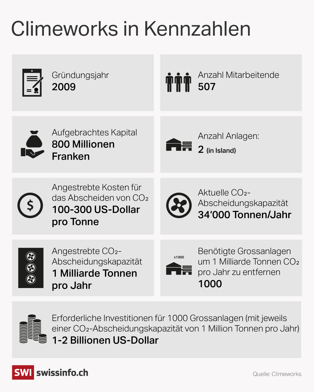 Die Ambitionen des Unternehmens, das bereits 800 Millionen Franken an Finanzmitteln erhalten hat, sind kühn: Bis 2050 sollen jährlich 1 Milliarde Tonnen CO₂ aus der Atmosphäre entfernt werden. Das entspricht etwa 2,5% der heutigen Jahresemissionen weltweit. Dafür müssten das Unternehmen und seine Partner:innen 1000 Grossanlagen bauen. Geschätzte Kosten: 1 bis 2 Billionen Franken.