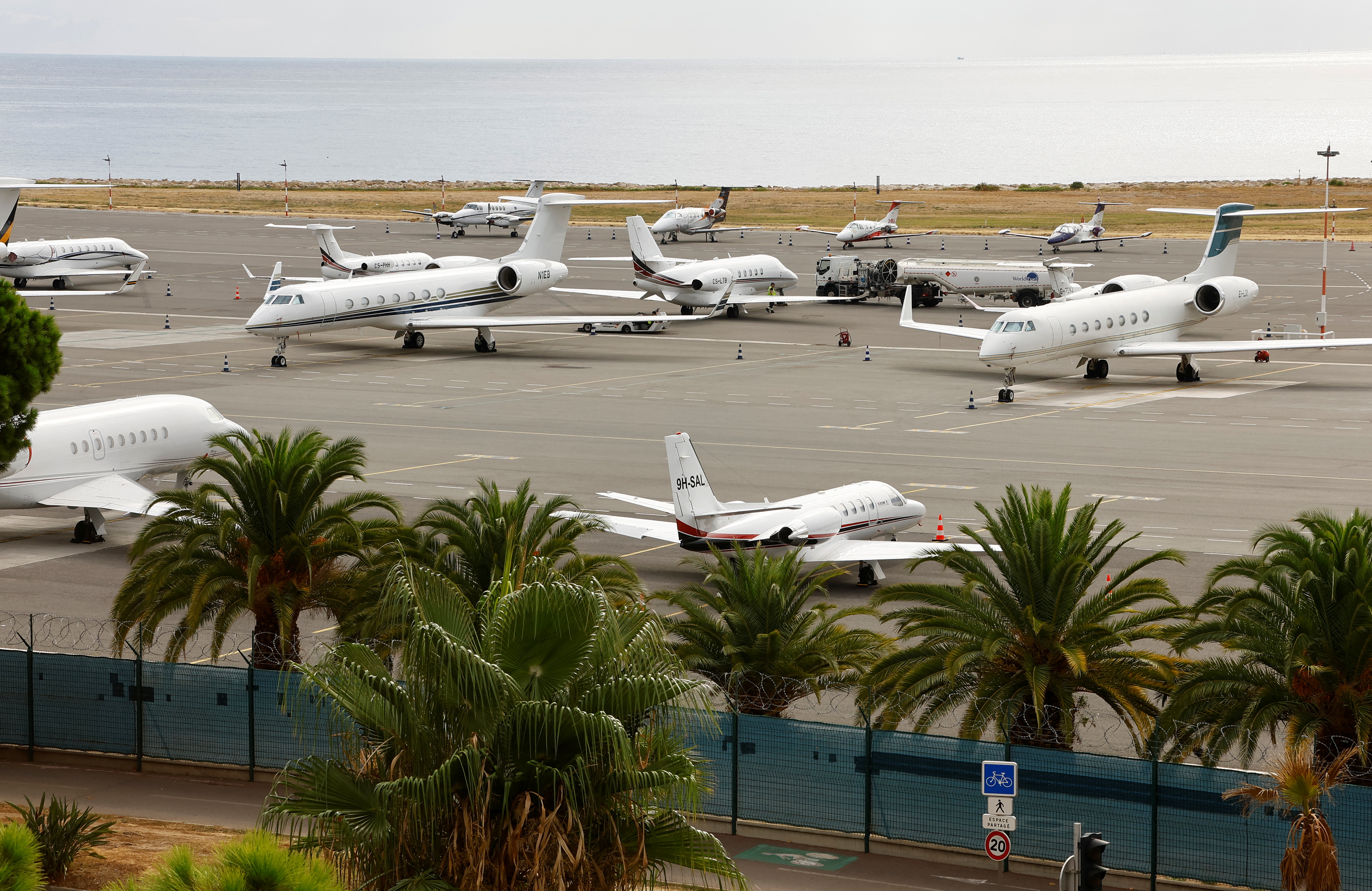 Ein Gulfstream-Jet aus Mailand landet. Der Fahrer eines schwarzen Mercedes-Kleinbusses begrüsst diskret die Flugpassagiere, bevor er sie zum Kleinbus begleitet. Es folgt ein weiterer Jet, diesmal aus Brüssel, den das Bodenpersonal neben einem halben Dutzend anderer Luxusflugzeuge abstellt. Diese warten auf die Erlaubnis zum Starten.