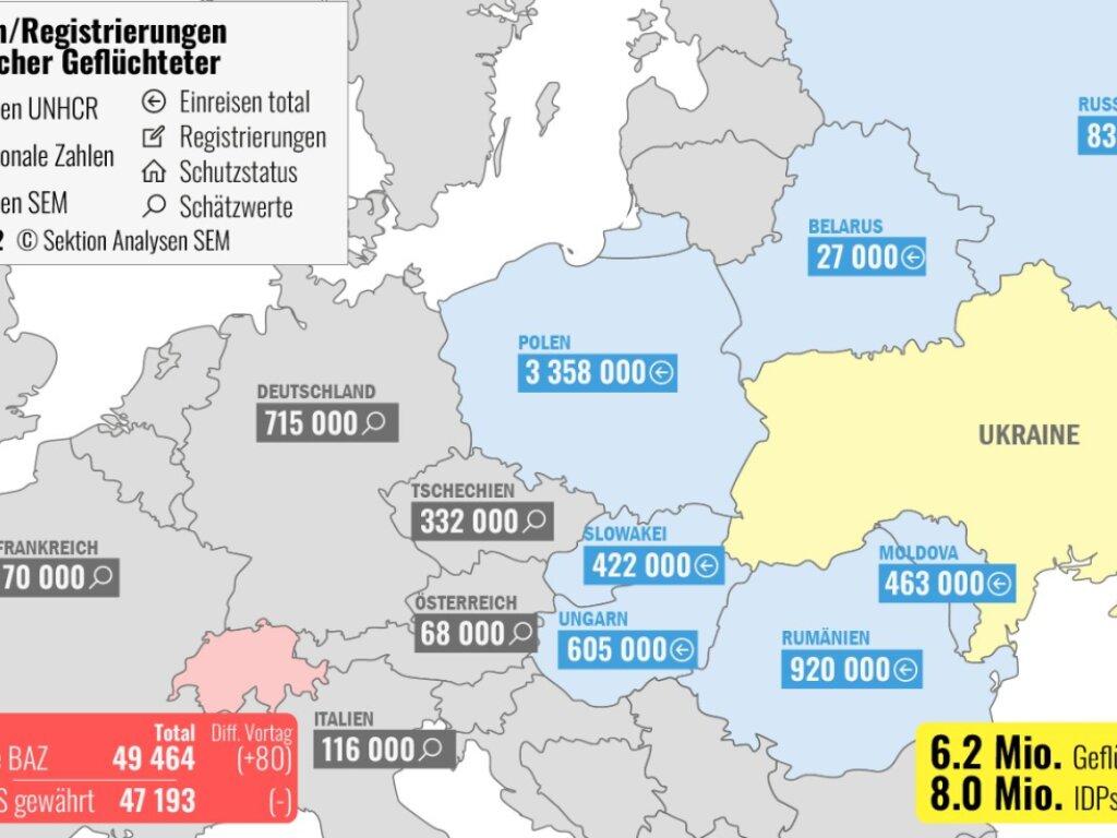 (Keystone-SDA) In der Schweiz haben die Bundesbehörden bis Montag 49’464 Flüchtlinge aus der Ukraine registriert. Das waren 402 mehr als am Freitag, wie das Staatssekretariat für Migration (SEM) auf Twitter bekannt gab.