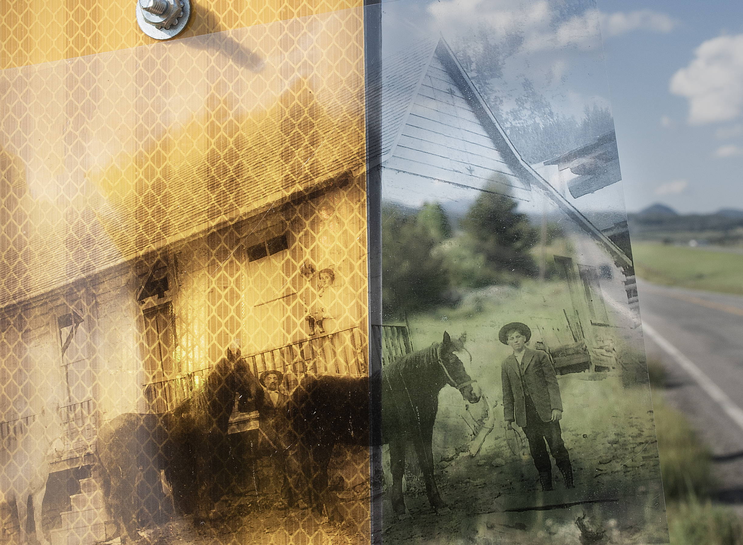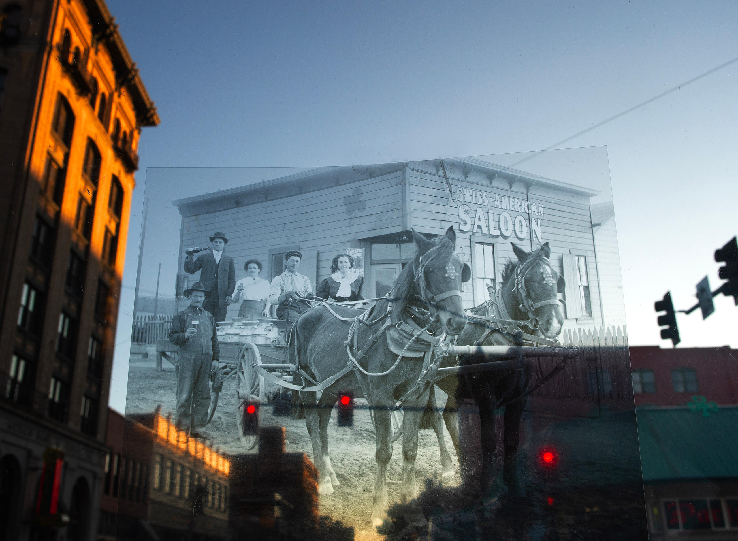 Mit Hilfe von Folien hat Leuenberger historische Fotos mit ihren eigenen Bildern von heute kombiniert, um die Geschichten der Tessiner Auswandererfamilien lebendig werden zu lassen und zu zeigen, wie viele Opfer nötig waren, um Butte zu der Stadt zu machen, die sie später wurde.