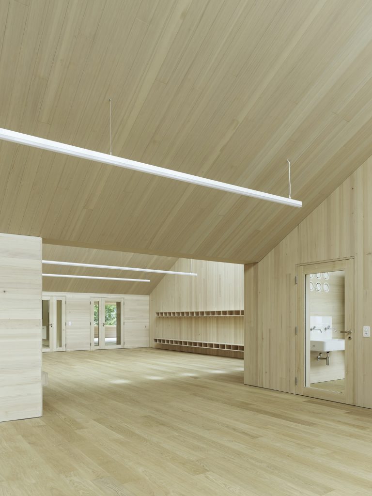 Das einstöckige Gebäude aus Holz, Beton und Stahl fügt sich harmonisch in die Landschaft und seine Lage zwischen zwei Dorfkernen ein. Es wird von oben belichtet, das spart Beleuchtungsenergie. Die Fenster sind nach Norden ausgerichtet, damit sich die Räume nicht aufheizen. Nach Süden hin sind die Dächer mit Solarpanelen belegt. Bei offenen Türen kann der Föhn in Süd-Nord-Richtung durch das Gebäude hindurchziehen.