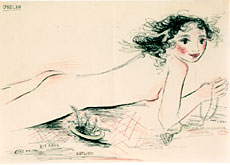 Doch auch die Malerin von Matt befreit sich, streift wieder einen Kokon ab. Die Zeichnung «Iselin» von 1941 zeigt ein auf dem Bauch liegendes Mädchen. Rosa sind die Pobacken, rosa angehaucht die Brustwarzen, rosarot die Bäckchen, rot der Mund. Kokett erotisch die grünen Schleifen im Haar.