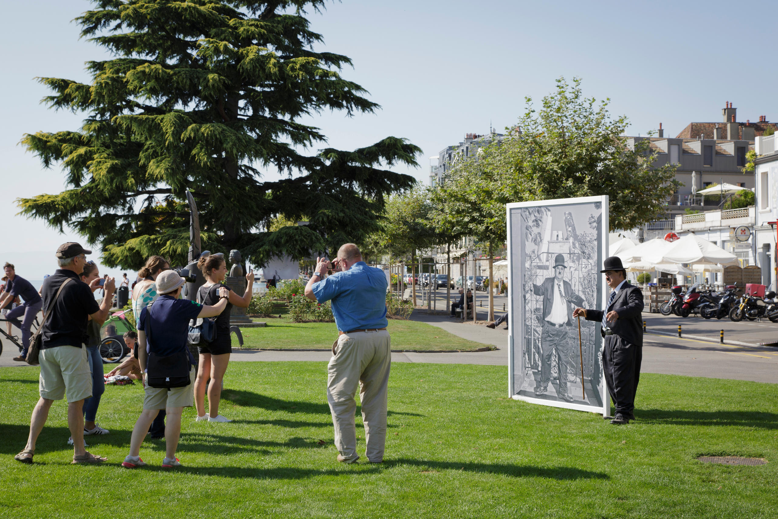 De Middel wurde ebenfalls nach Vevey eingeladen, wo sie letzten September ihre Chaplin-Arbeiten am «Festival Images»Externer Link präsentieren durfte, während Aswani in den Fusstapfen seines grossen Idols durch Vevey fegte und das Publikum auf Trab hielt.