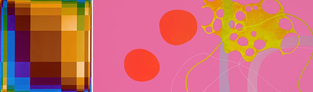 Richard Paul Lohse: "Fünfzehn symmetrische Farben mit braunem Zentrum", 1950-67; Hanspeter Hofmann: "Ohne Titel", 2004.