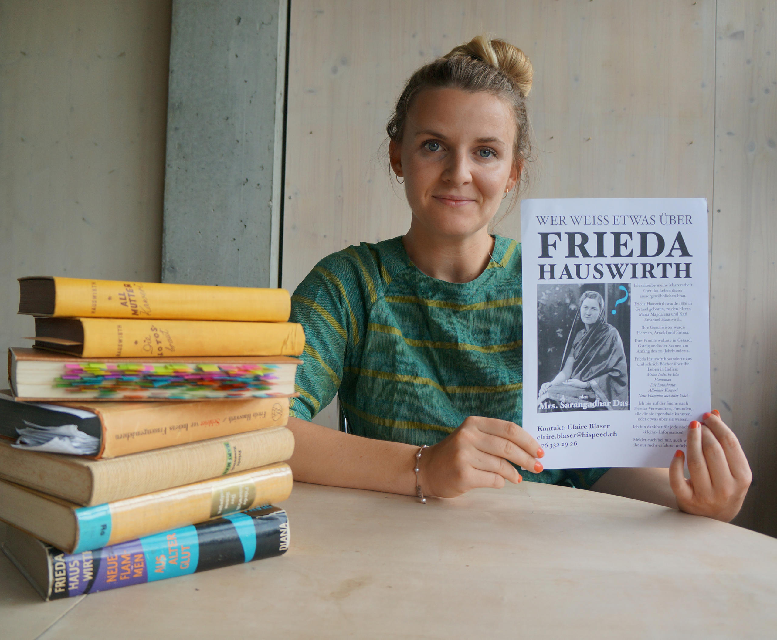 «Sie war eine mutige, eigenwillige, kreative und intellektuelle Frau, die gegen alle Konventionen ihrer Zeit verstiess», sagt Claire Blaser. Die junge Bernerin stiess im Sommer 2017 in der Uni-Bibliothek in London zufällig auf das Buch «Colonial Switzerland» und dort auf einen Artikel über die Schweiz als Schauplatz der indischen anti-kolonialistischen Bewegung anfangs 20. Jahrhundert. Erwähnt wurde darin auch Frieda Hauswirth aus Gstaad im Berner Oberland. Blaser wollte mehr über diese Frau erfahren – aber da war nichts. So begann sie, öffentliche Register und Archive zu durchforsten.