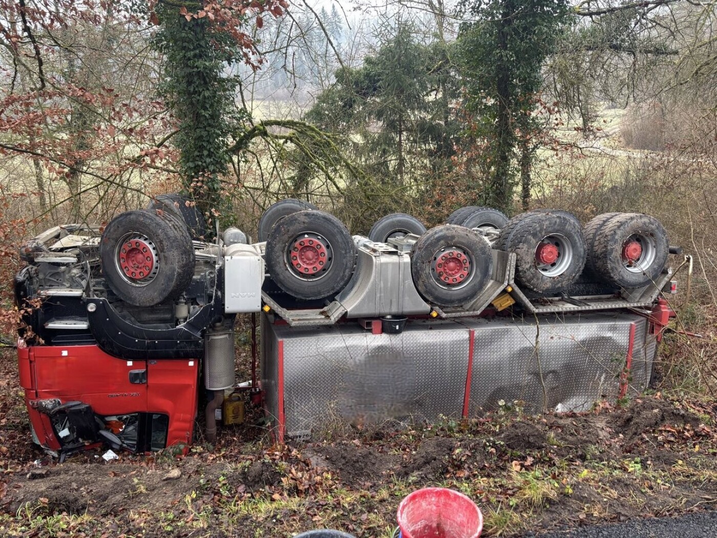 Bei einem Unfall ist ein Lastwagen am Freitagmorgen in Hallau eine Böschung hinuntergestürzt. Der LKW überschlug sich und blieb auf dem Dach liegen. Der Fahrer blieb unverletzt.