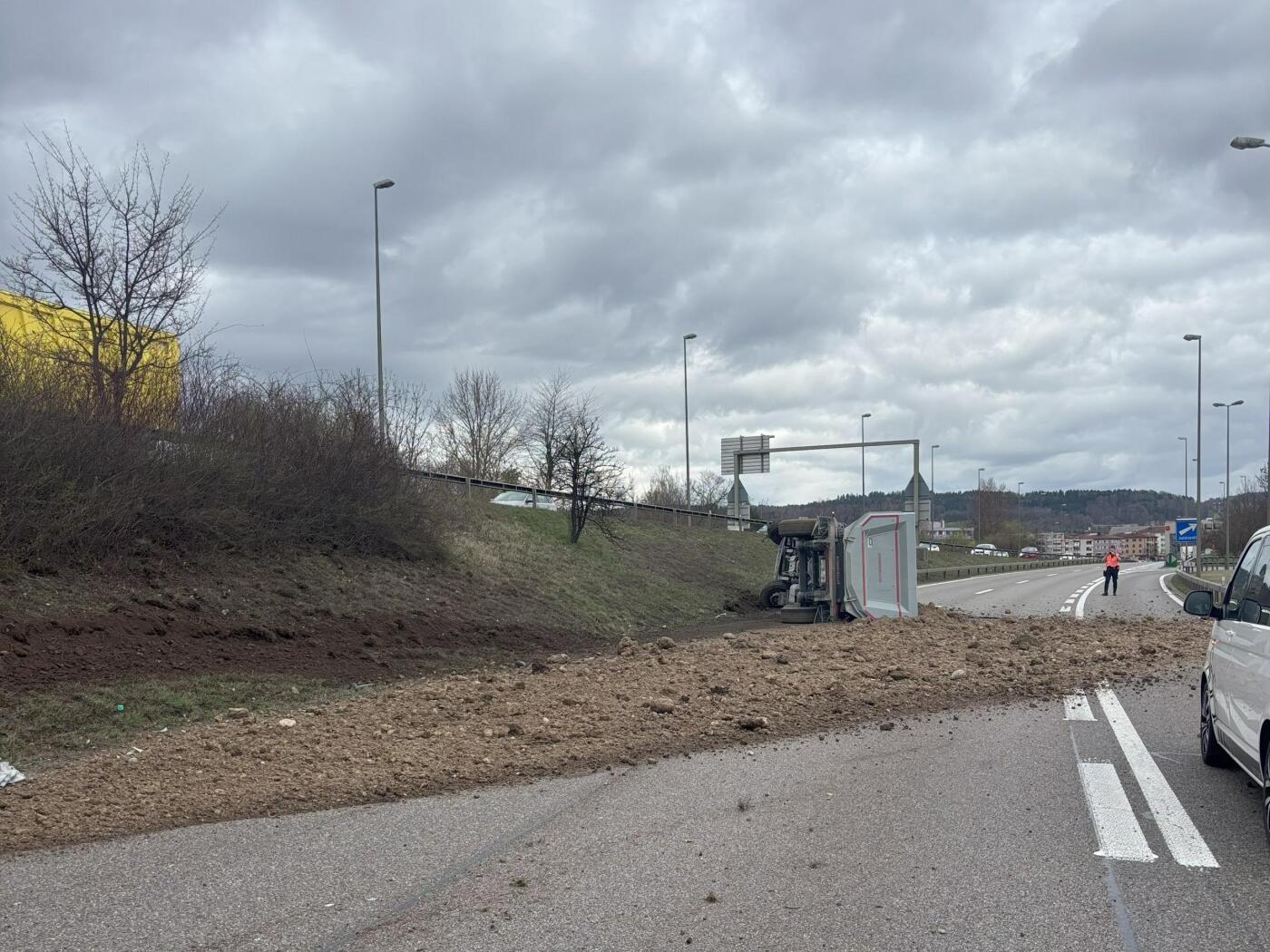 Das Fahrzeug kippte um und rutschte auf die Fahrbahn zurück. Die Ladung landete auf der Autobahn. Der 58-jährige Lenker zog sich mittelschwere Verletzungen zu und wurde ins Spital gefahren.