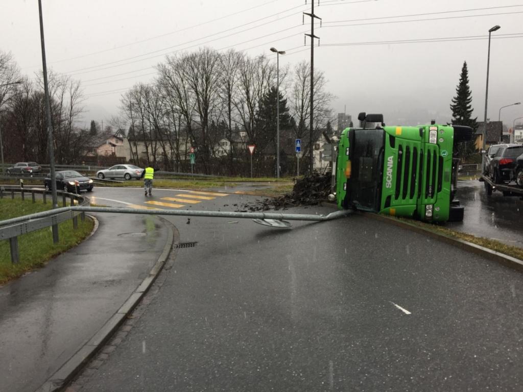 Der 32-Tonnen-Lastwagen sei beim Kreisel des Autobahnzubringers A13 auf die rechte Seite gekippt, teilte die Kantonspolizei St. Gallen am Donnerstag mit. Dabei habe er einen Kandelaber gefällt. Weil durch den Unfall die Verbindung von Buchs nach Schaan FL unterbrochen wurde, sei kurzfristig ein Verkehrschaos entstanden.