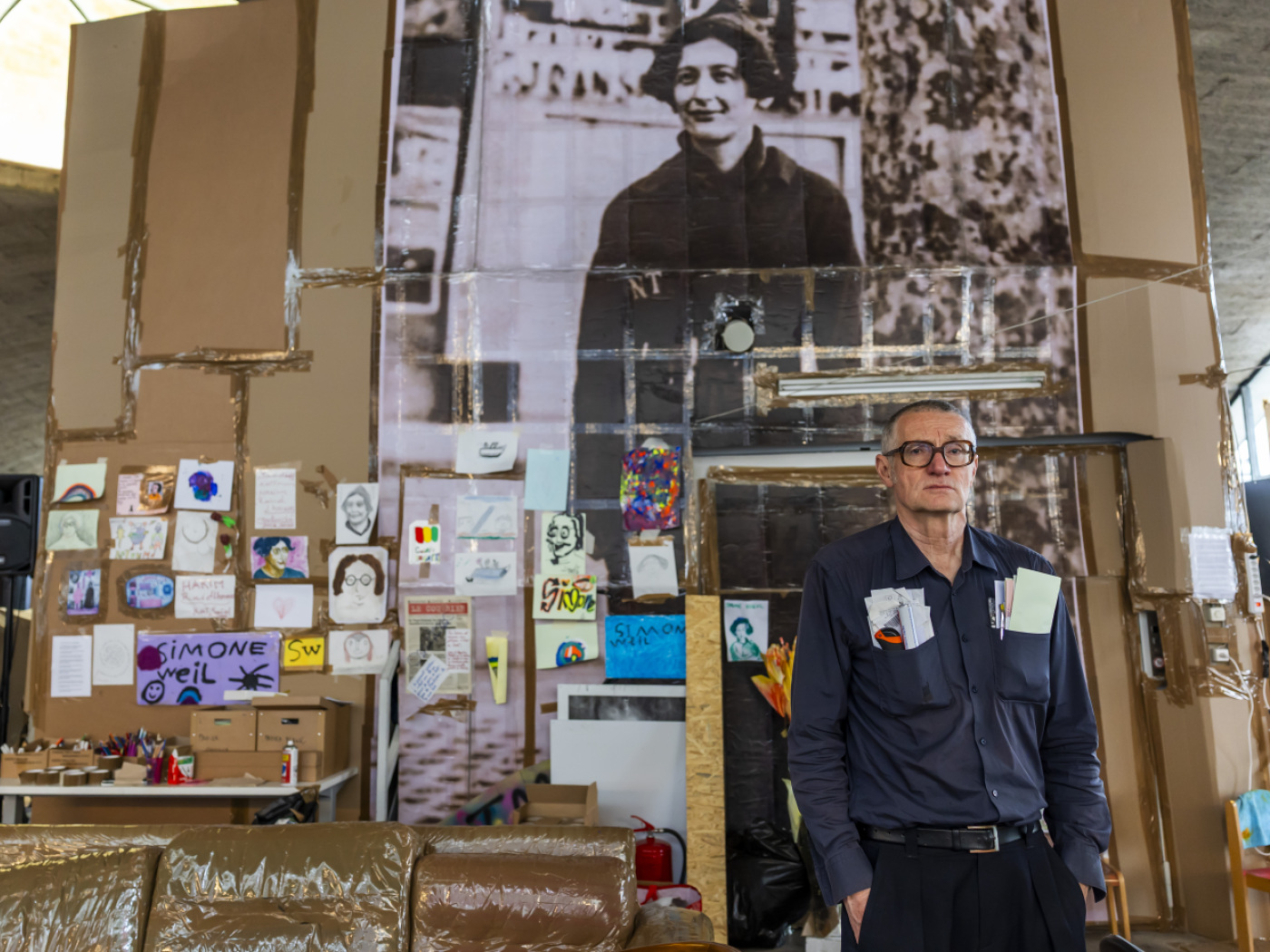 Die französische Philosophin Simone Weil (1909-1943) wird mit einer Vielzahl von Aktivitäten geehrt, die auch unerwartet sind. «Da hält ein Philosoph eine Lesung und daneben trainiert ein Boxclub», erzählt Hirschhorn. Die Taschen seines Hemdes quellen über von Notizzetteln, Stiften und – zuvorderst, gut sichtbar: das Buch «Schwerkraft und Gnade» (Orig.: «La pesanteur et la grâce», 1947), das, posthum veröffentlicht, die wesentlichen Gedanken der Philosophin zu Liebe, dem Bösen, Unglück, Gewalt und Schönheit enthält. «Simone Weil war eine Kämpferin. Sie erinnert uns daran, dass man seine Kraft beherrschen muss, wenn man Gewalt vermeiden will», meint Hirschhorn.