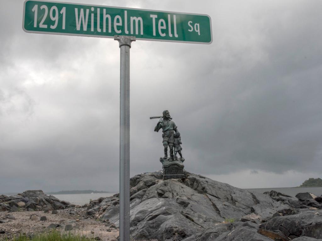 Die Insel gehört zwei Schweizern, der vier Meter hohe Tell war Hofstetters Idee. Er wollte mit der Statue auf die Grundwerte Demokratie und Freiheit verweisen, auf denen sowohl die Schweiz wie auch die USA aufbauen.