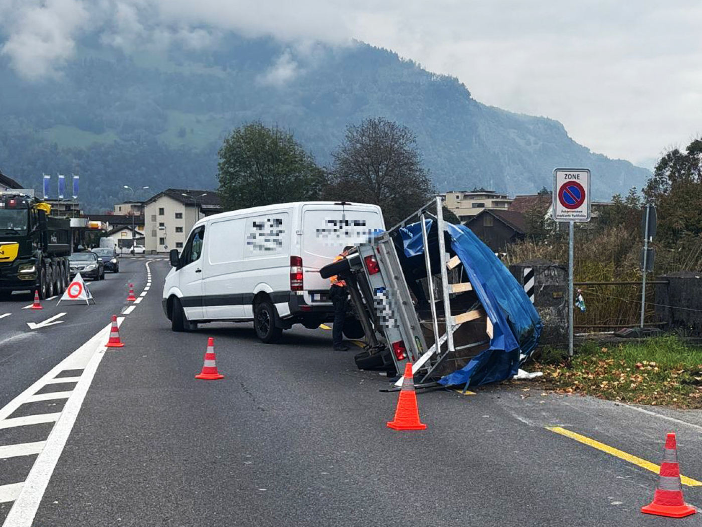Der Anhänger eines Lieferwagens hat sich am Donnerstag in Näfels GL auf der Zubringerstrasse überschlagen und ist auf der Seite liegen geblieben. Die Ladung war laut der Polizei nicht genügend gesichert, rutschte beim Abbiegen auf die Seite und brachte den Anhänger aus dem Gleichgewicht.