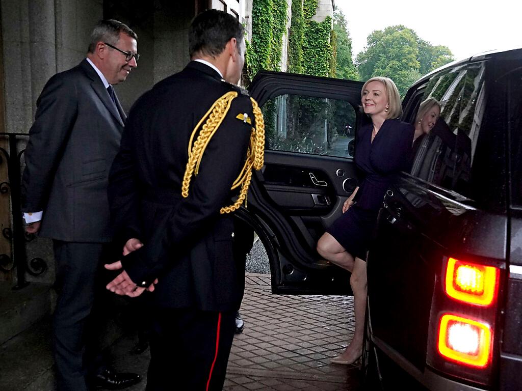 Die neu gewählte Parteivorsitzende der Konservativen, Liz Truss, wird von Oberstleutnant Tom White, dem Leibwächter von Königin Elizabeth II., und ihrem Privatsekretär Sir Edward Young begrüßt, als sie in Balmoral zu einer Audienz bei Königin Elizabeth II. eintrifft, wo sie eingeladen wird, Premierministerin zu werden und eine neue Regierung zu bilden. Foto: Andrew Milligan/Pool PA/dpa