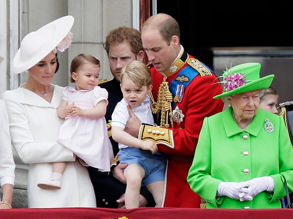 Neben ihr stand Bruder George, der ebenfalls in sommerlichen Farben gekleidet war. Vater William trug Gardeuniform, Kate einen schicken Hut. Auch Thronfolger Prinz Charles und Ehefrau Camilla, Prinz Harry und weitere Royals präsentierten sich den Untertanen.