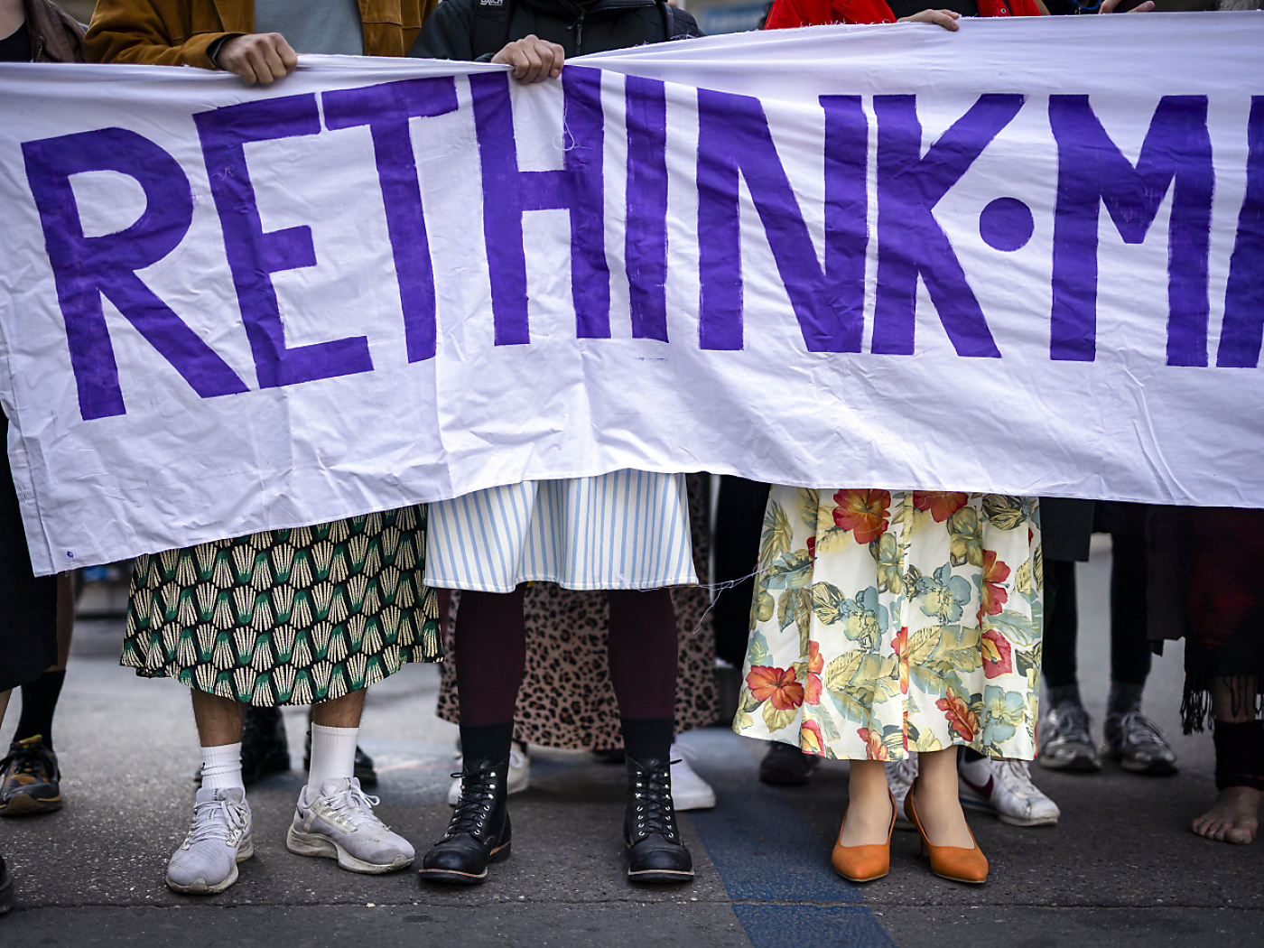 Wann ist ein Mann ein Mann? Am dritten "Rethink-Masculinity-Day" haben sich am frühen Dienstagmorgen rund 40 Männer in Röcken am Bahnhof Stadelhofen in Zürich versammelt, einige davon in Stöckelschuhen.