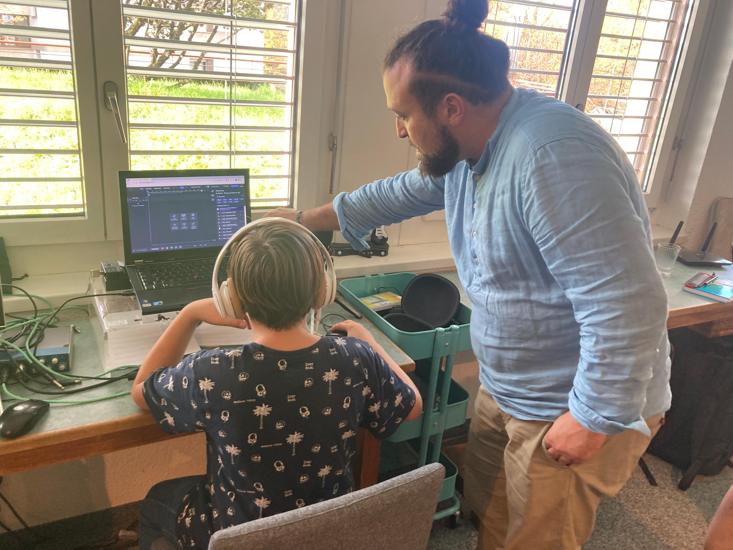 Die Schülerinnen und Schüler nennen ihn Mauri. Sein voller Name ist Maurizio Audino. Er ist gut 40 Jahre alt, trägt einen Pferdeschwanz und ein Hemd mit koreanischem Kragen. Mauri unterrichtet in Münsingen, einer Kleinstadt mit 12’000 Einwohner:innen, rund zwanzig Minuten von Bern entfernt. An den Wänden des Klassenzimmers hängen Aufgaben für Gruppenaktivitäten, Klassenfotos, der Stundenplan und Informationen für Eltern.